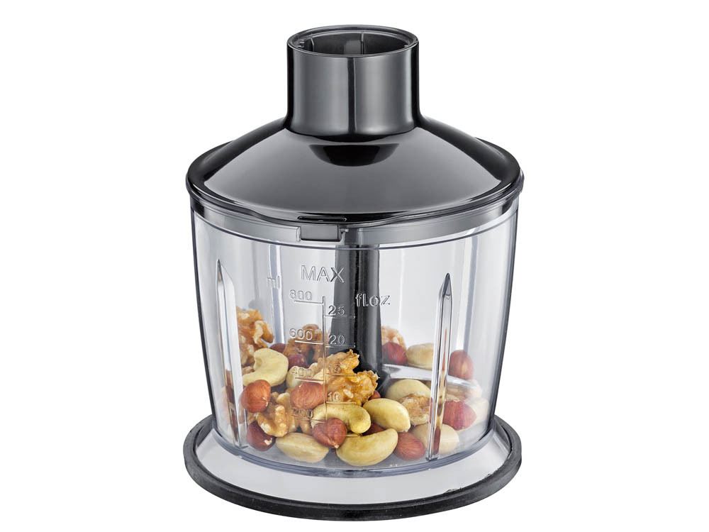 Pojemniki o pojemności 0,8 litra, wykonane z przezroczystego tworzywa sztucznego z antypoślizgowymi podstawami: jeden wysoki, drugi niski z wewnętrznymi ostrzami do siekania.