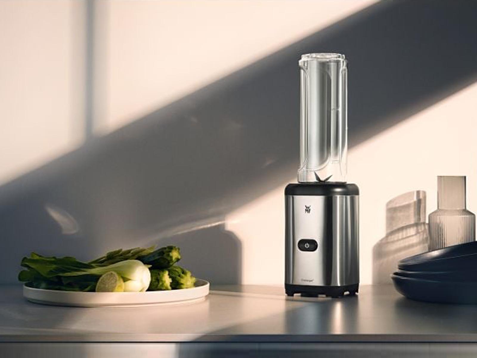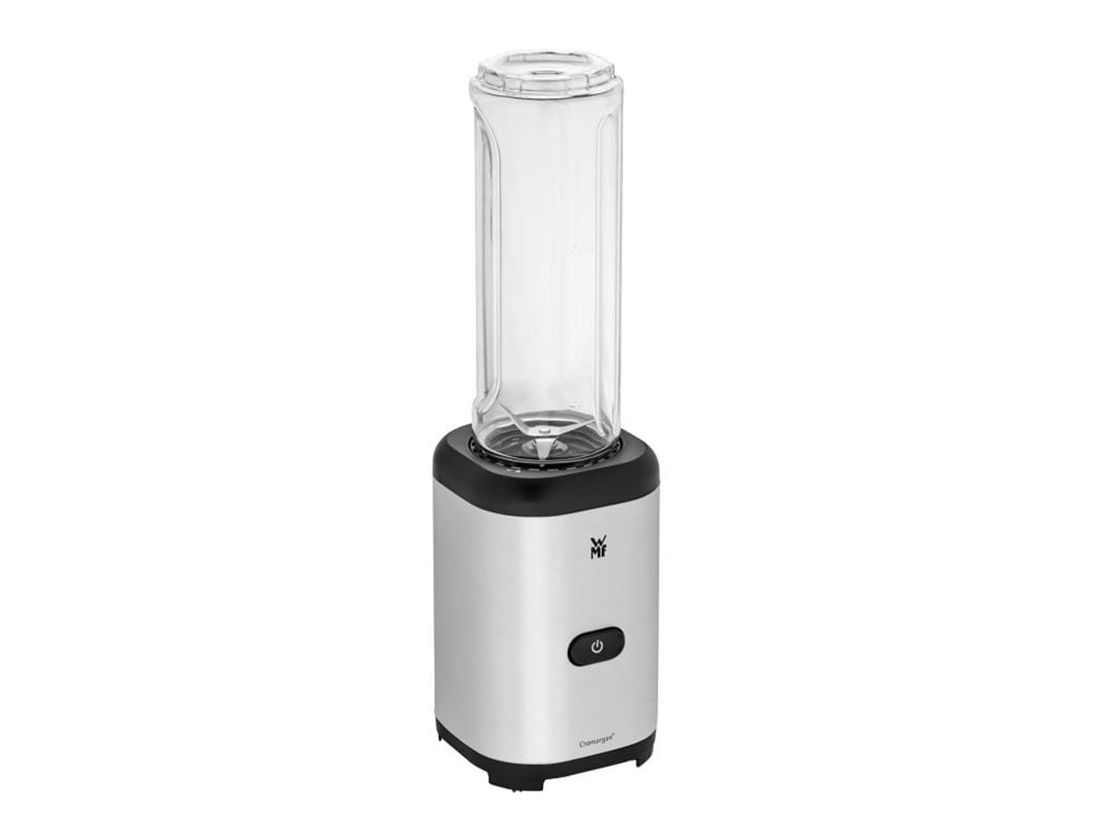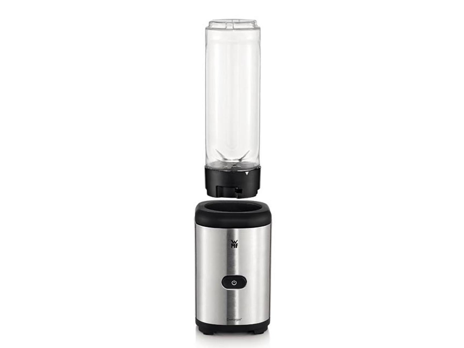 Elegancki nablatowy kompaktowy blender do szybkiego przygotowywania koktajli z pojemnikiem z funkcją bidonu.