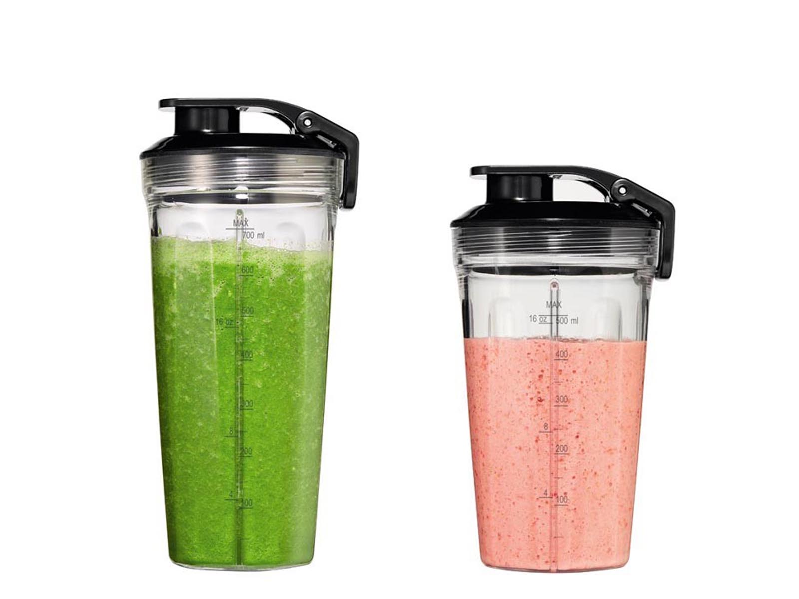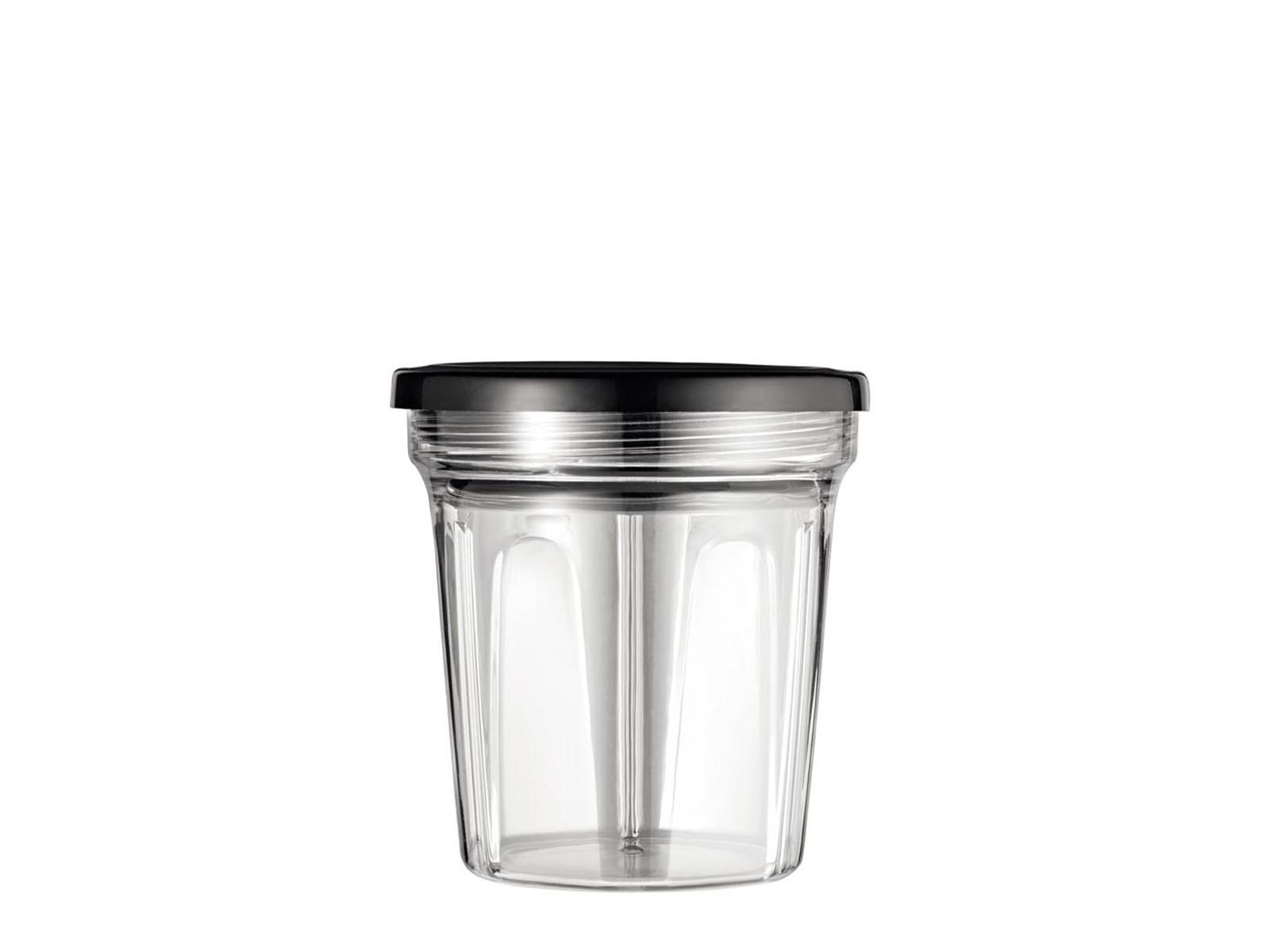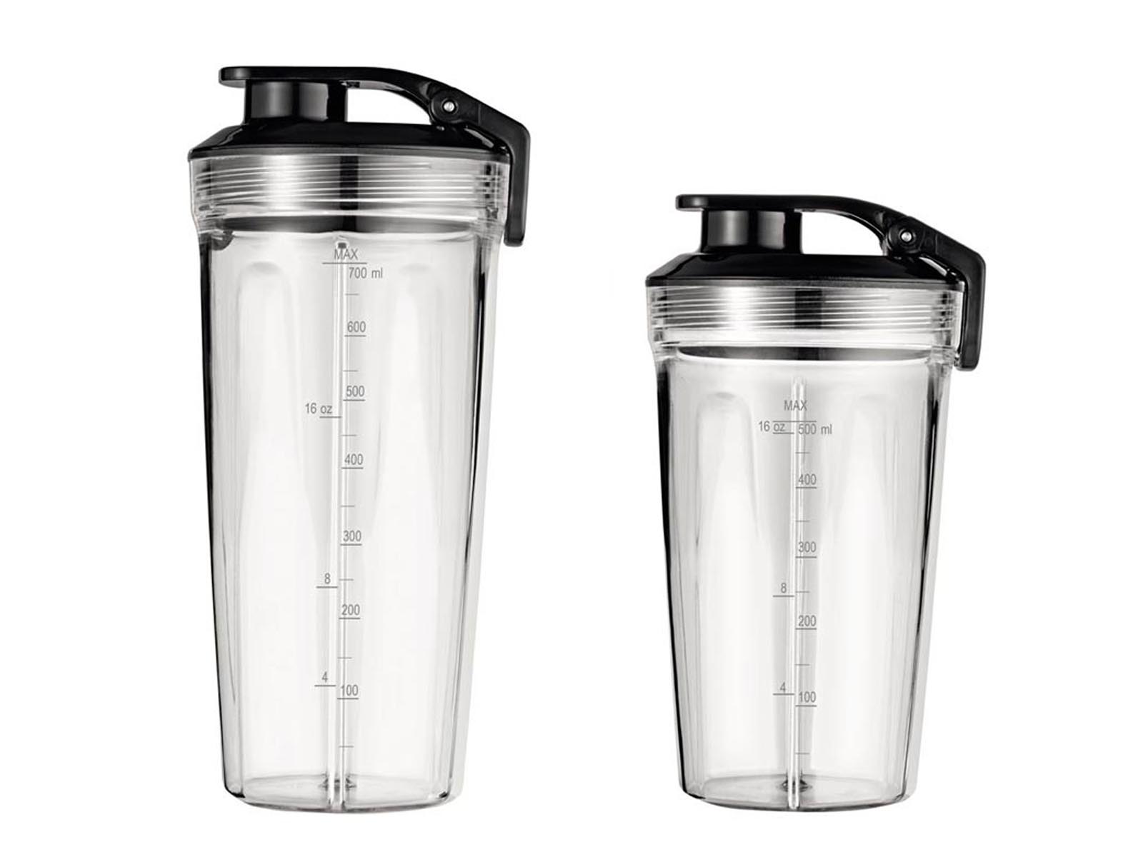 W zestawie blender posiada 4 wymienne rożnej wielkości zamykane pojemniki do rozdrabniania, nakręcane na moduły z nożami: dzbanek kielichowy z o pojemności 1,2 litra, pojemnik na koktajle o pojemności 500 ml, pojemnik na koktajle o pojemności 700 ml oraz pojemnik do mielenia o pojemności 300 ml.