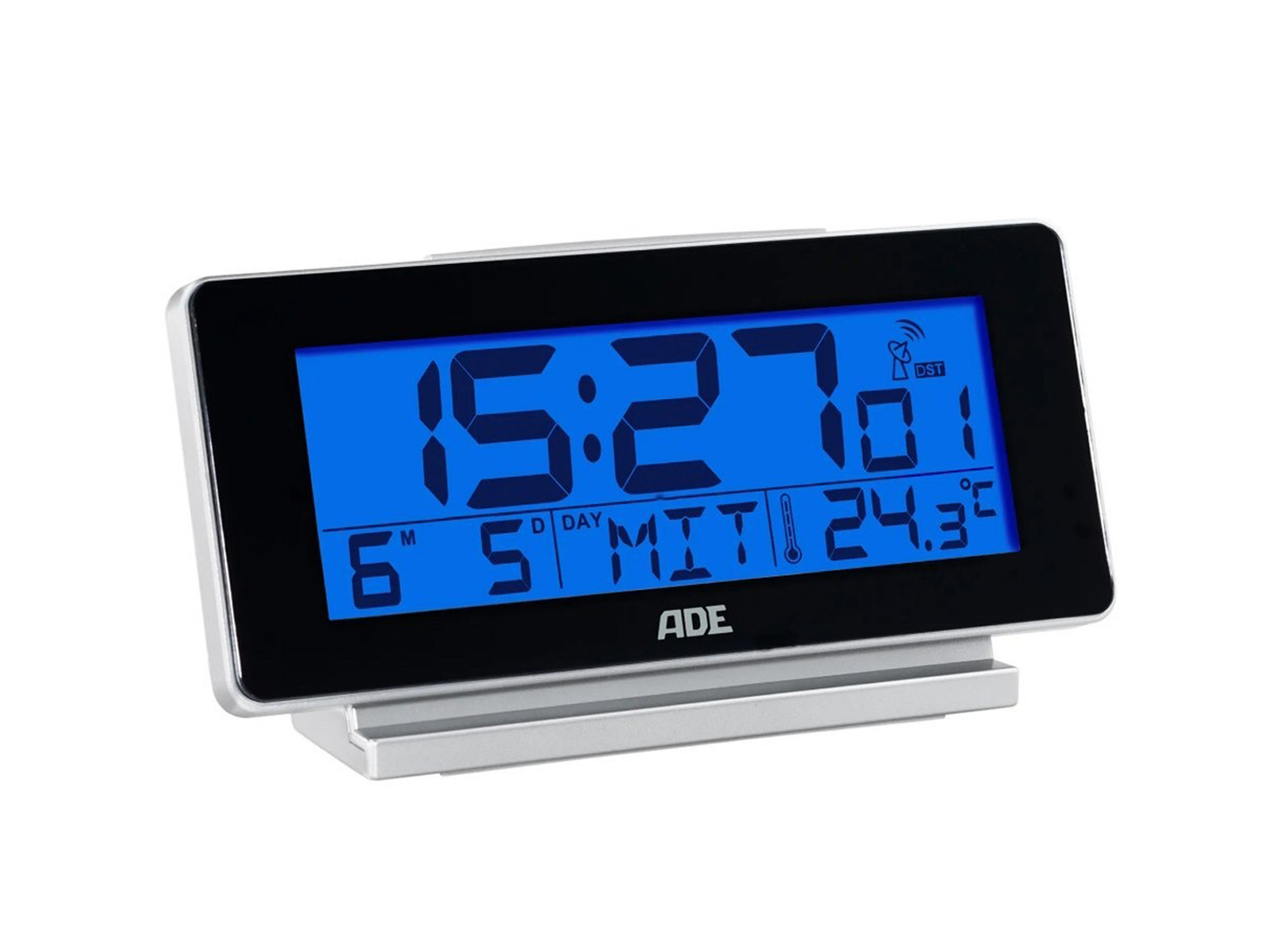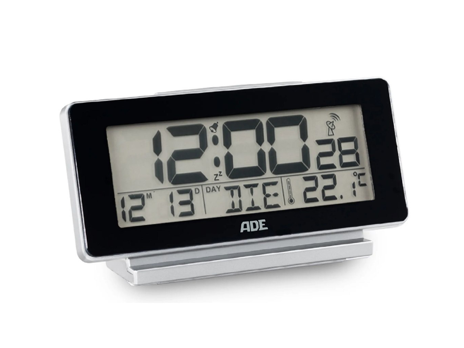 Budzik elektroniczny ADE to funkcjonalne urządzenie, które automatycznie ustawia czas dzięki sygnałowi radiowemu, eliminując konieczność ręcznej zmiany przy przejściu z czasu letniego na zimowy. Wyposażony w funkcję 5-minutowej drzemki oraz podświetlany ekran, zapewnia wygodę podczas codziennego użytkowania. Model dodatkowo wyświetla temperaturę w pomieszczeniu w °C lub °F oraz kalendarz dostępny w 7 językach. Lekko pochylona konstrukcja ułatwia odczyt i podkreśla praktyczny charakter urządzenia.