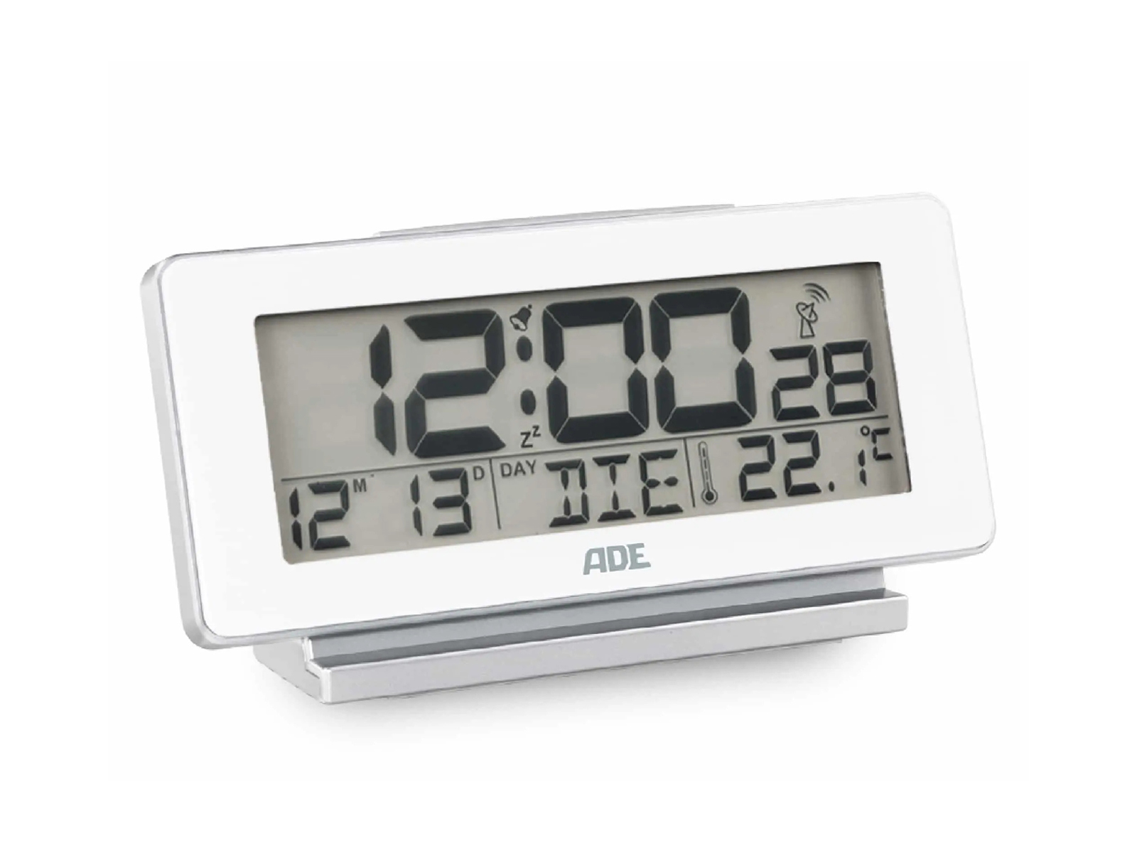 Budzik elektroniczny ADE to funkcjonalne urządzenie, które automatycznie ustawia czas dzięki sygnałowi radiowemu, eliminując konieczność ręcznej zmiany przy przejściu z czasu letniego na zimowy. Wyposażony w funkcję 5-minutowej drzemki oraz podświetlany ekran, zapewnia wygodę podczas codziennego użytkowania. Model dodatkowo wyświetla temperaturę w pomieszczeniu w °C lub °F oraz kalendarz dostępny w 7 językach. Lekko pochylona konstrukcja ułatwia odczyt i podkreśla praktyczny charakter urządzenia.