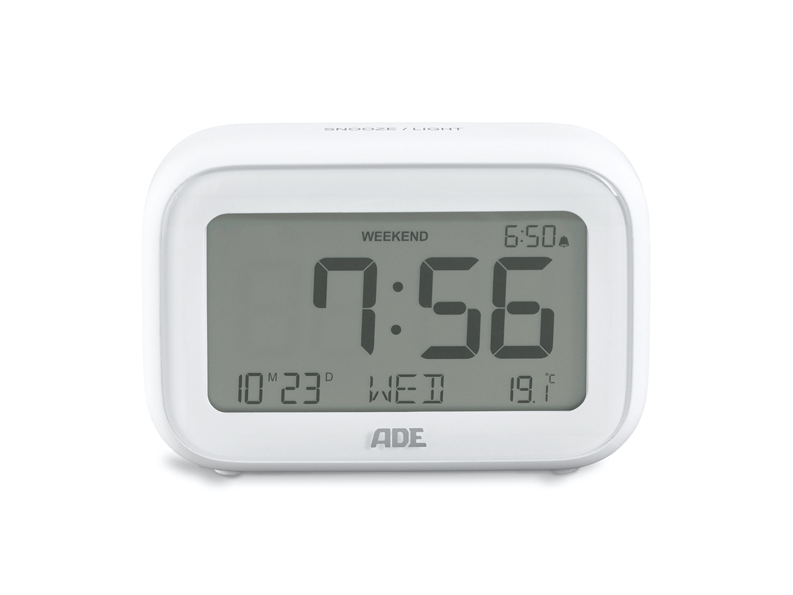 Budzik elektroniczny ADE to funkcjonalne urządzenie, które oprócz alarmu oferuje wyświetlanie daty z dniem tygodnia i temperatury w pomieszczeniu. Posiada funkcję weekendową, dzięki której budzik automatycznie wyłącza alarmy w soboty i niedziele, a także praktyczną funkcję drzemki. Podświetlany ekran sprawia, że wszystkie informacje są czytelne także w nocy.
