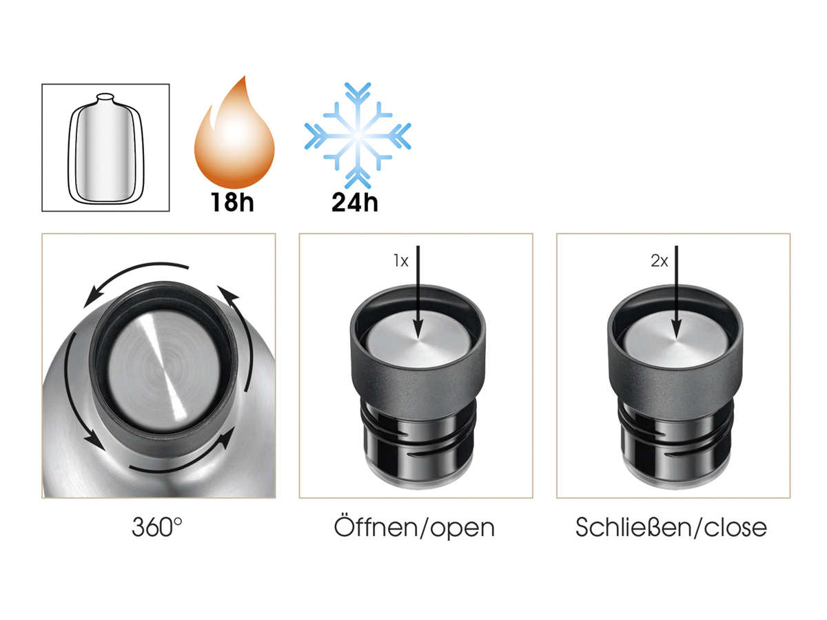 Butelka posiada podwójne ścianki o znakomitych właściwościach izolacyjnych, które zapewniają, że kawa lub herbata przez długi czas pozostają gorące, a woda, sok lub lemoniada zimne i orzeźwiające - butelka utrzymuje temperaturę napojów ciepłych realnie przez ok. 18 godzin i zimnych przez 24 godziny.