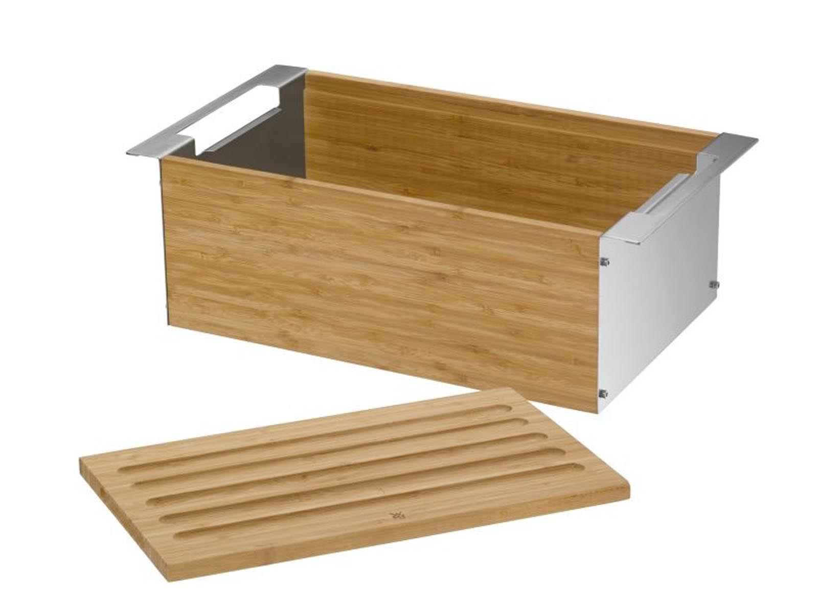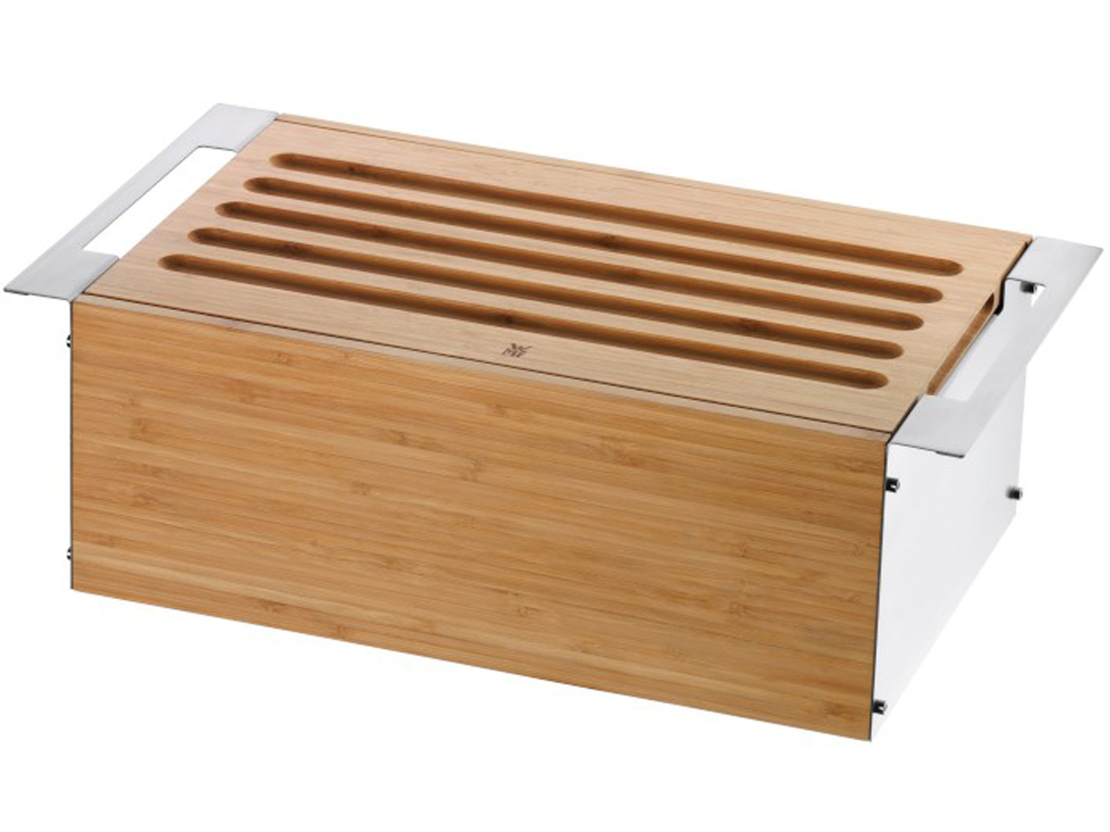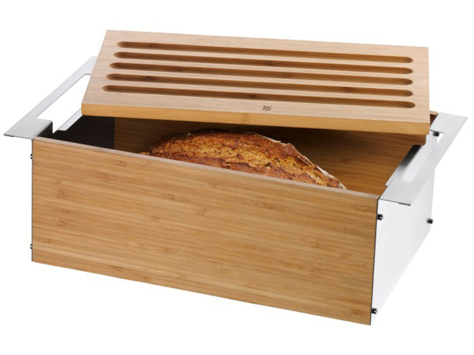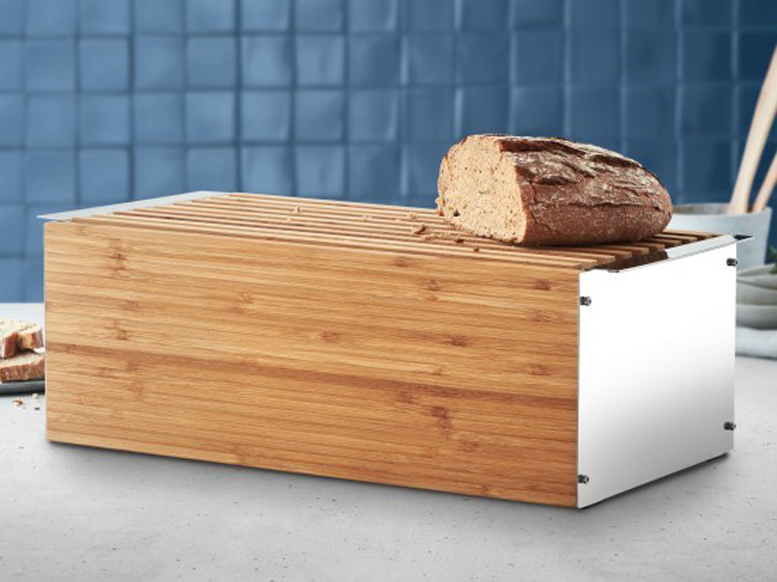 Chlebak wraz z pokrywą wykonany z drewna bambusowego posiadającego właściwości antybakteryjne, krótkie boki pojemnika chlebaka wykonane z wysokiej jakości szczotkowanej stali nierdzewnej Cromargan®.