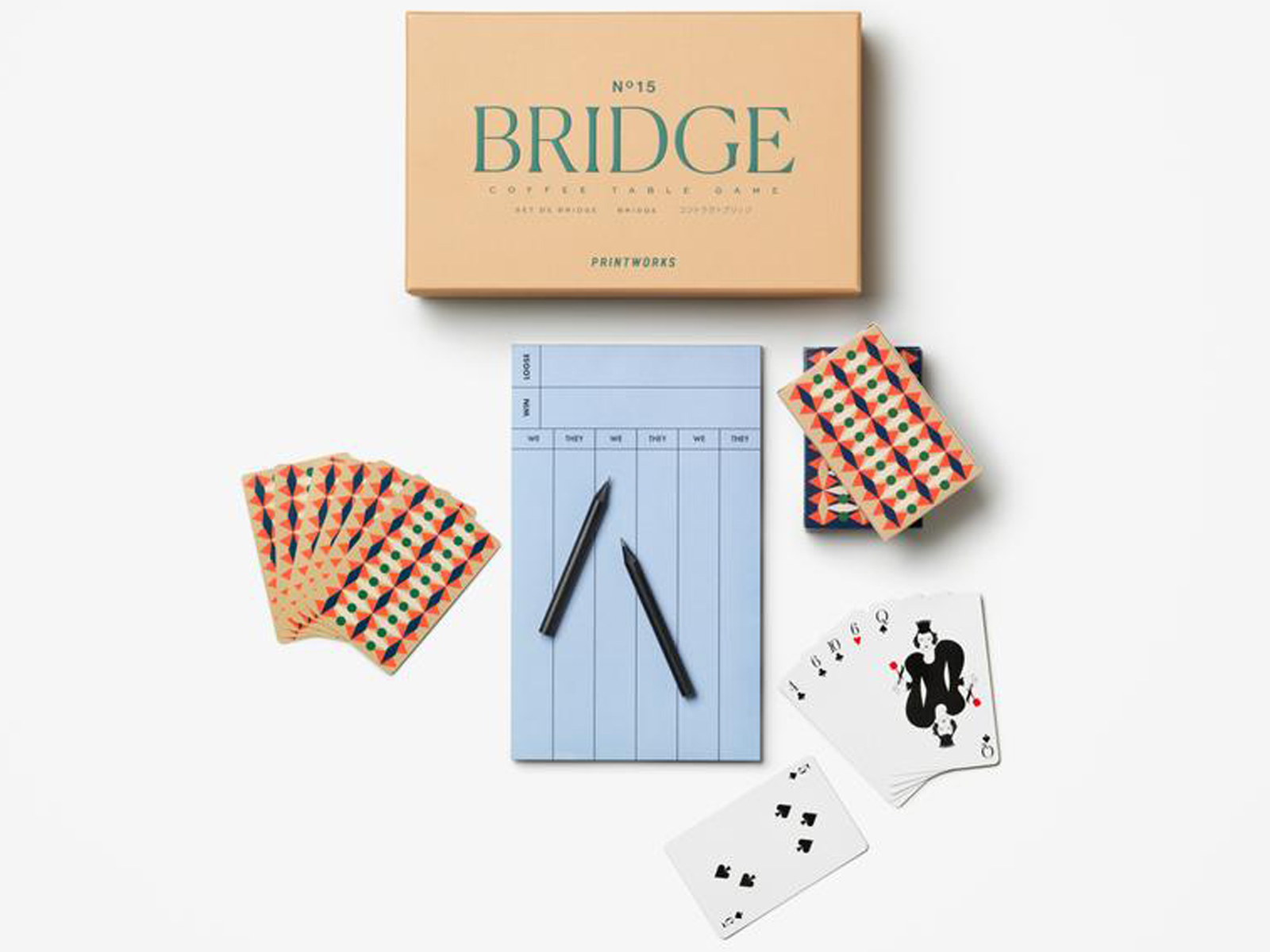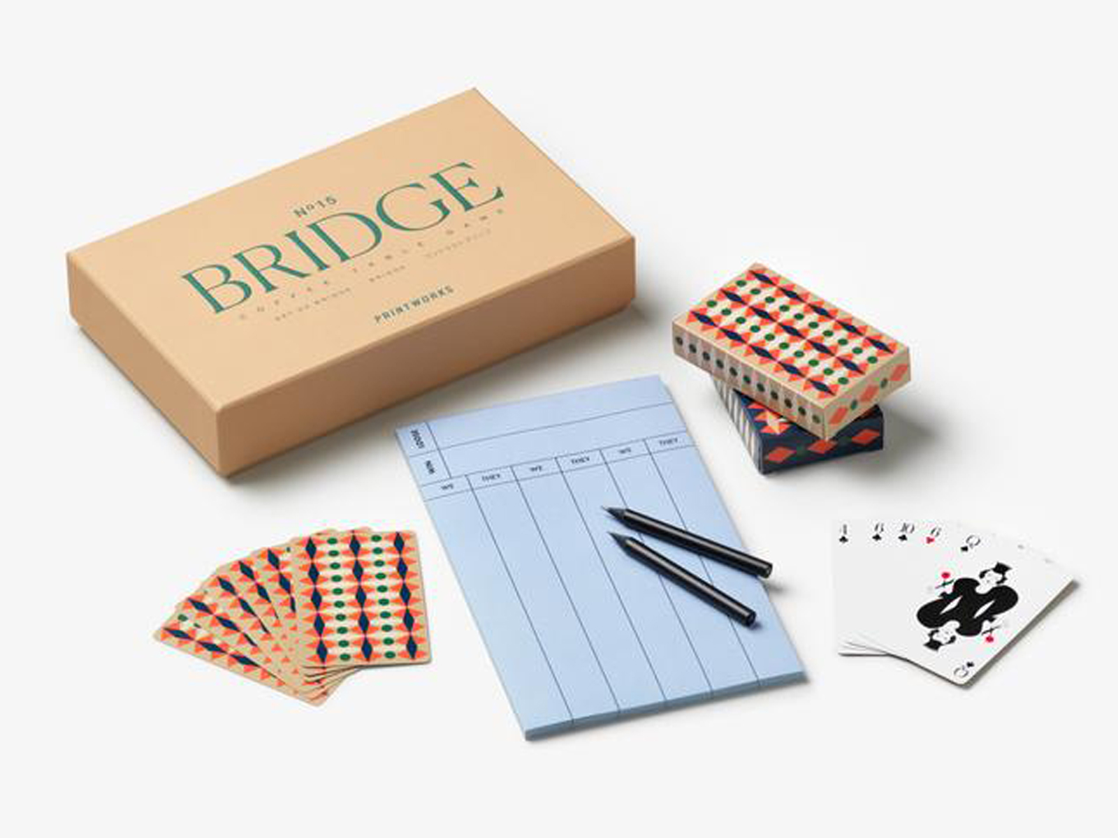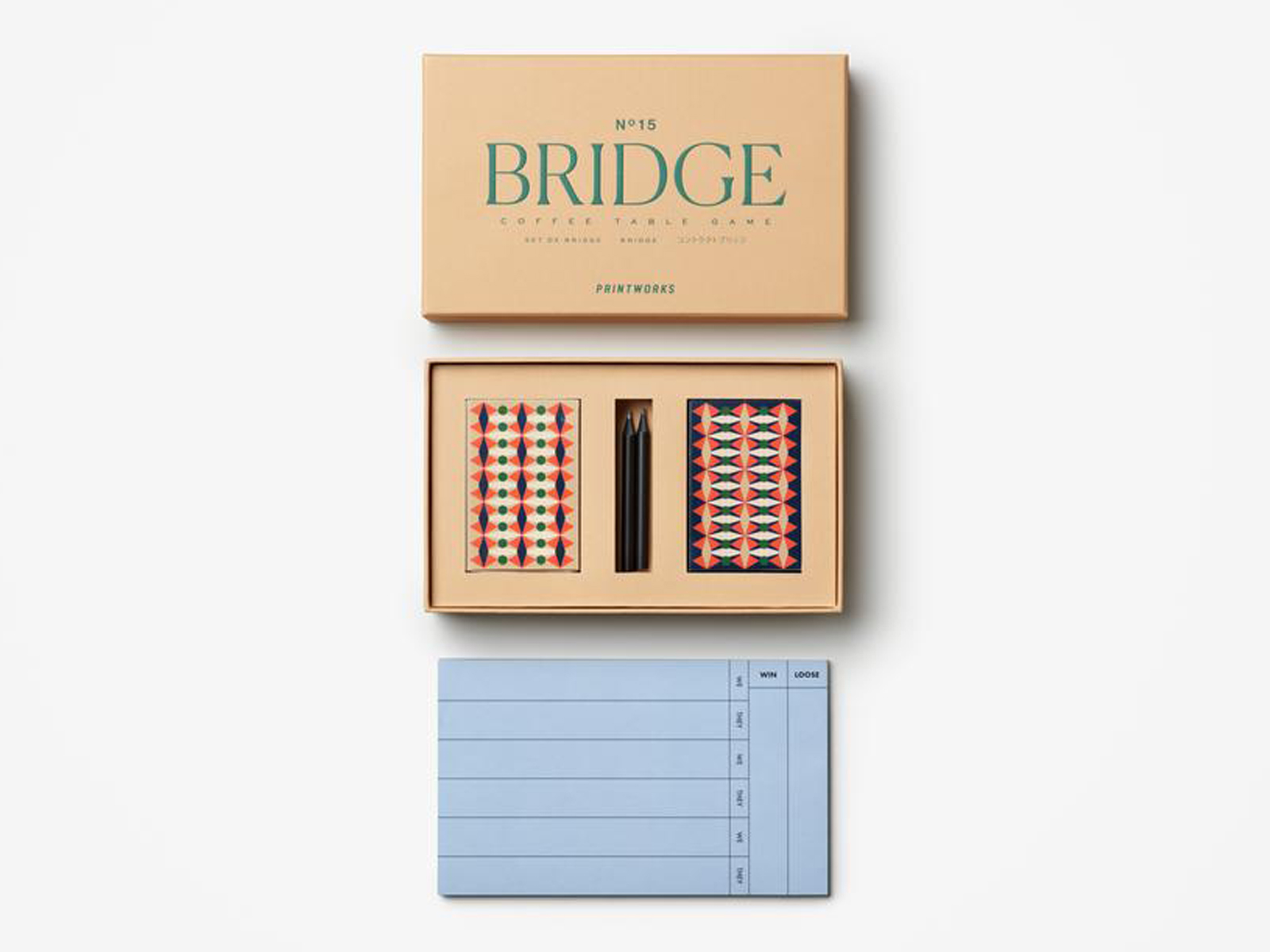 Bridge Set jest częścią kolekcji gier Classic, wyróżniającej się harmonijną typografią o odpowiednio dobranej, stonowanej palecie barw. Poza godzinami świetnej rozrywki w rodzinnym gronie zaoferuje też inspirację artystyczną formą, która stanie się ozdobą na kominkach, regałach, kredensach i stolikach kawowych. Podobnie jak inne gry Printworks, dzięki wysokim walorom estetycznym jest kreatywnym pomysłem na angażujący, a jednocześnie pięknie zdobiony prezent na każdą okazję. Opakowanie każdego zestawu przykuwa wzrok, zapada głęboko w pamięć i przechowuje elementy do zabawy, która budzi szczególny sentyment. Dodatkowo, doskonale prezentuje się we wszystkich wnętrzach.