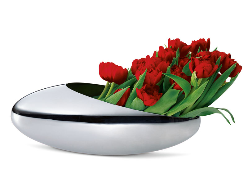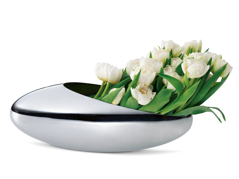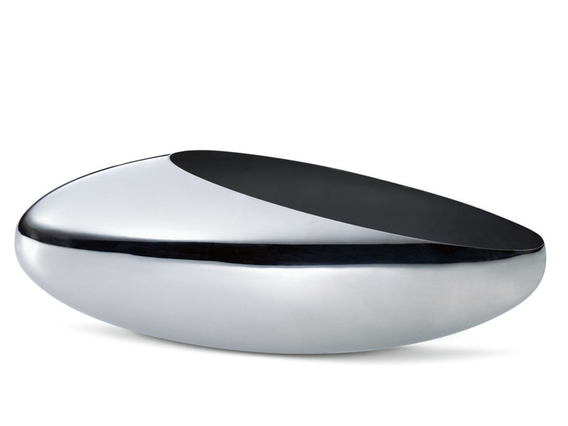 Pojemnik wykonany z polerowanej stali nierdzewnej, posiada niezwykłą, futurystyczną, nieco kosmiczna formę, przypominającą kamień lub kokon z zaokrąglonym dużym wycięciem.