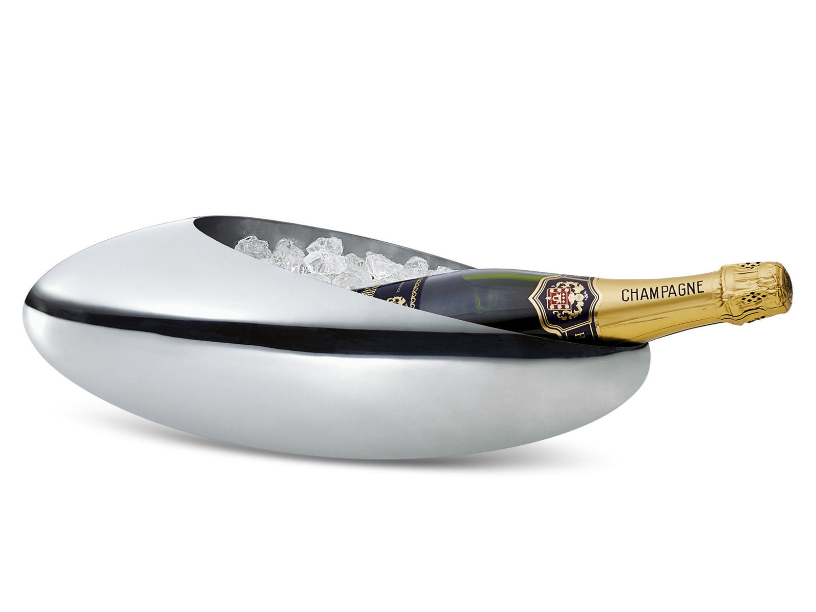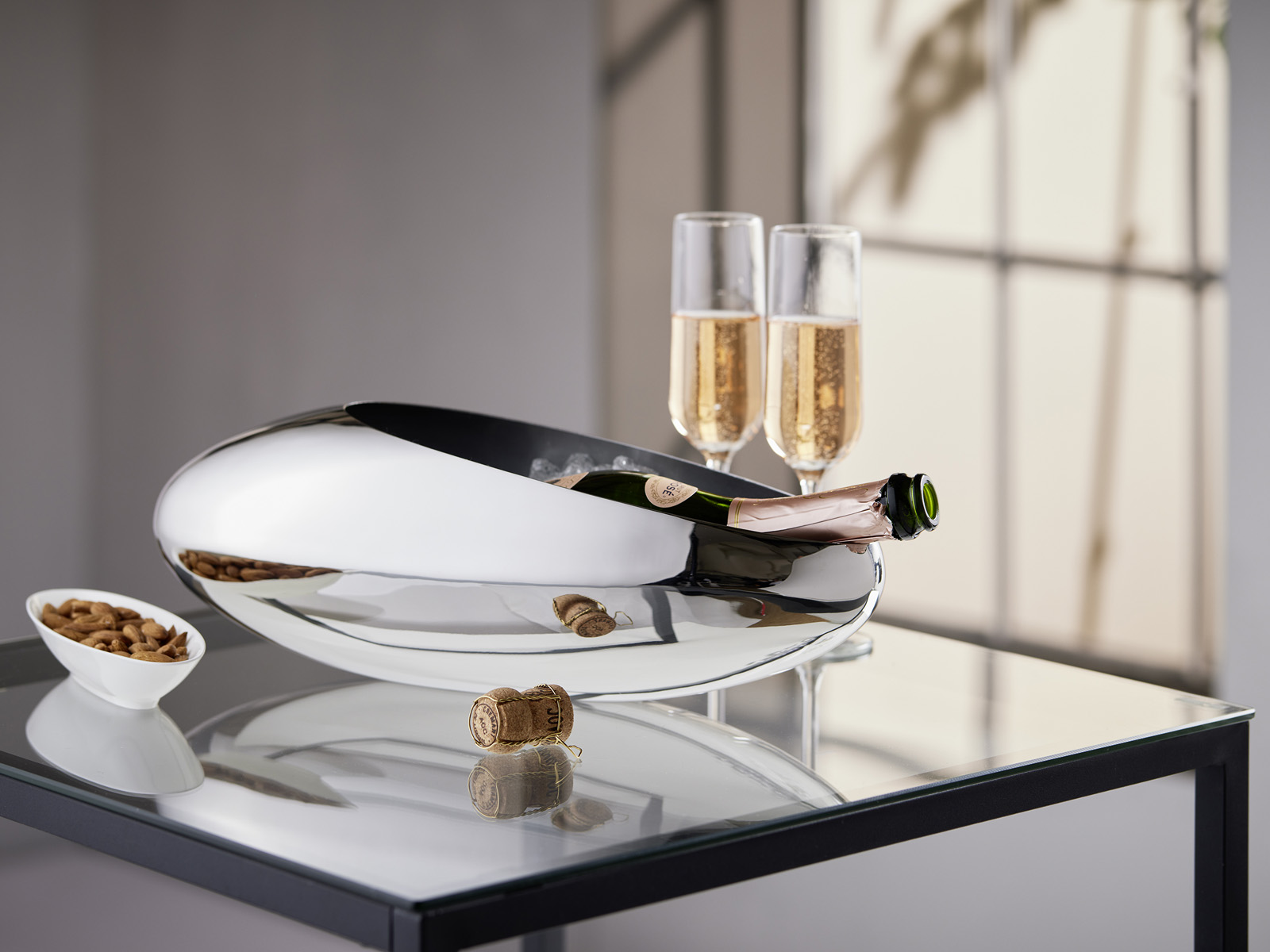 Elegancki bardzo oryginalny dwufunkcyjny pojemnik przeznaczony do użytku jako cooler do chłodzenia na lodzie butelek wina i szampana lub jako przyciągający wzrok wazon do bujnych kwiatowych bukietów np. tulipanów.