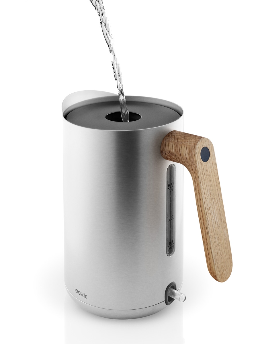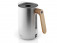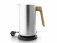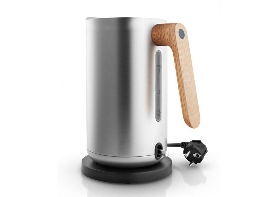 Obudowa czajnika wykonana ze szczotkowanej stali nierdzewnej z dębowym geometrycznym uchwytem zapewniającym pewny chwyt.