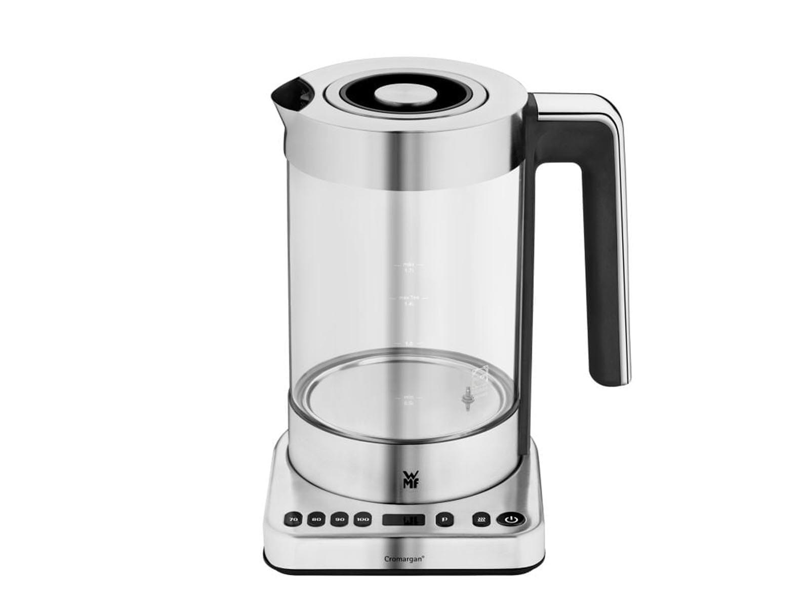 Obudowa czajnika cylindryczna wykonana z wytrzymałej odpornej na zarysowania stali nierdzewnej 18/10 Cromargan® z solidnym antypoślizgowym uchwytem oraz szklanymi bokami wykonanymi z wytrzymałego przezroczystego bezbarwnego żaroodpornego szkła SCHOTT DURAN®.