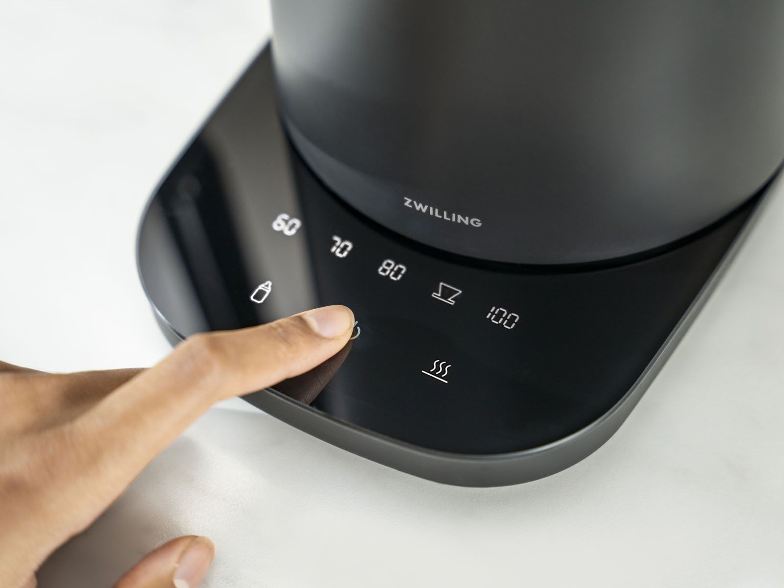 Czajnik Zwilling Enfinigy Pro to nowoczesny, wysokiej jakości czajnik elektryczny z innowacyjną elektroniczną regulacją temperatury i innych parametrów w postaci 7 dedykowanych programów ustawianych za pomocą stacji dokującej. Podobnie jak wersja Ocmfort, wersja Pro posiada również izolacją ciepła, polegającą na podwójnej obudowie, która gwarantuje zarówno utrzymanie wysokiej temperatury przez dłuższy czas oraz jednoczesne zachowanie bezpiecznej i przyjemnie chłodnej ścianki zewnętrznej.