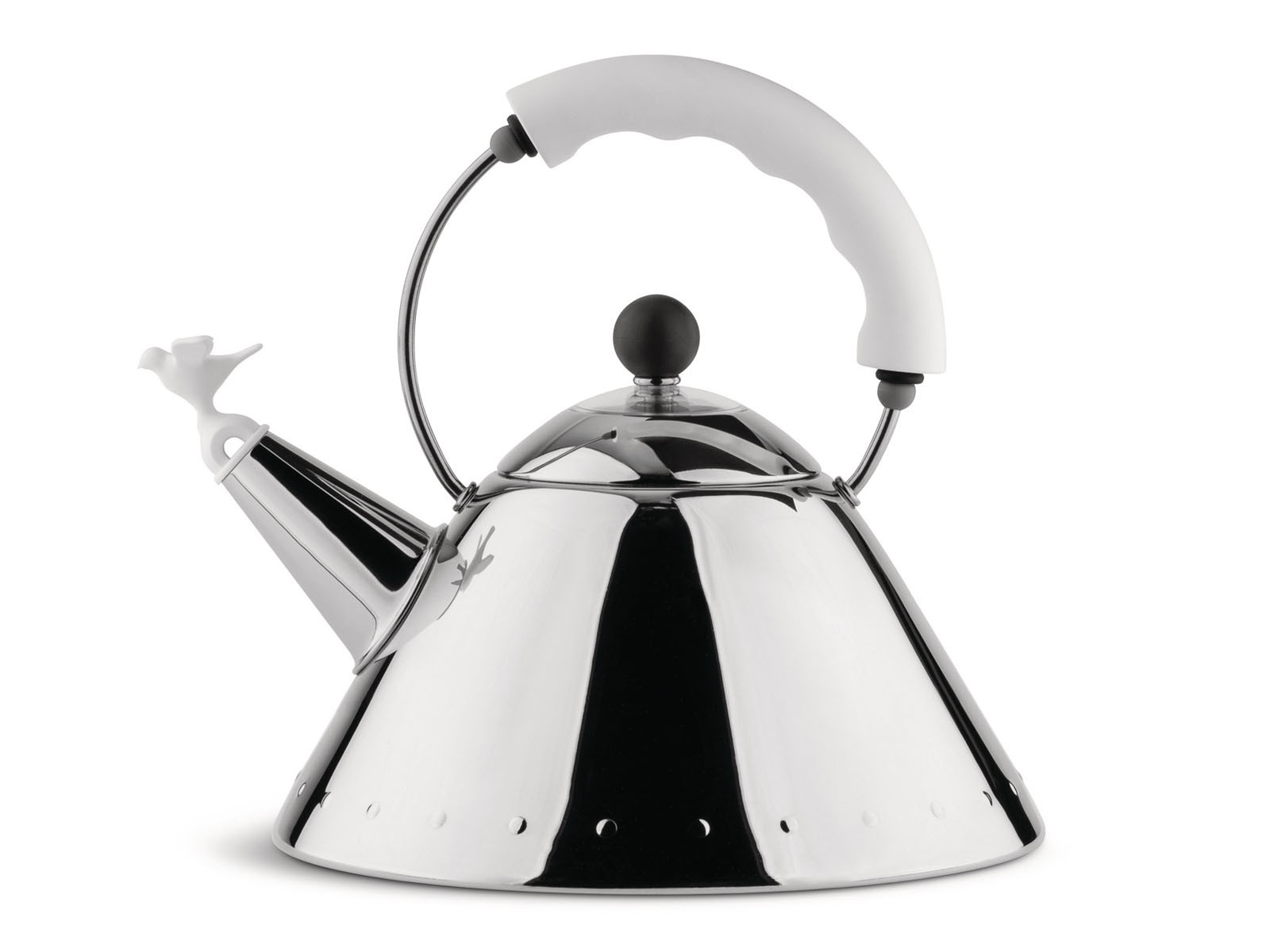 Czajnik Bird to przede wszystkim charakterystyczny stożkowy kształt, ergonomiczna rączka oraz wyposażenie w gwizdek w kształcie ptaszka, który sygnalizuje gotowanie się wody.