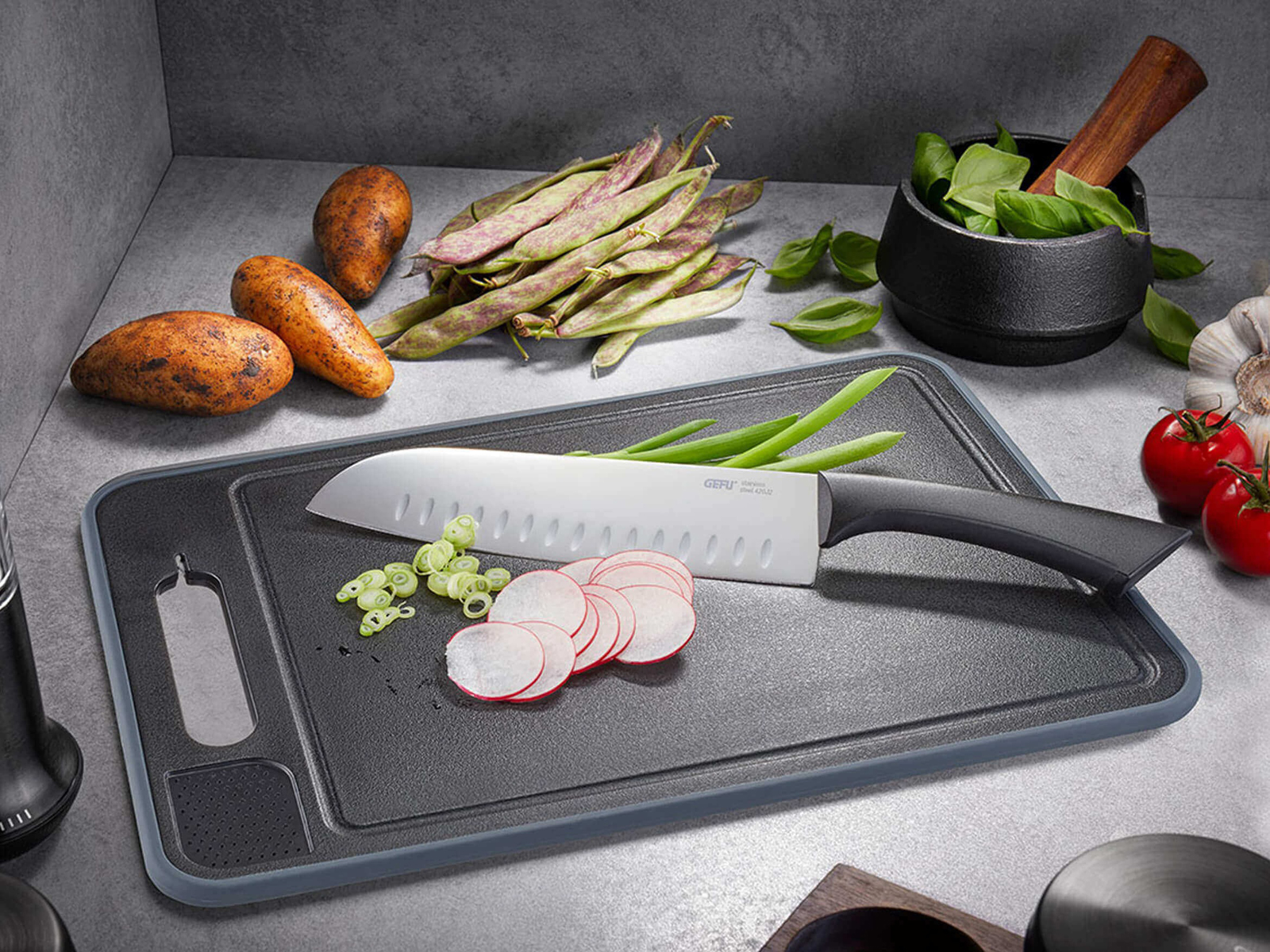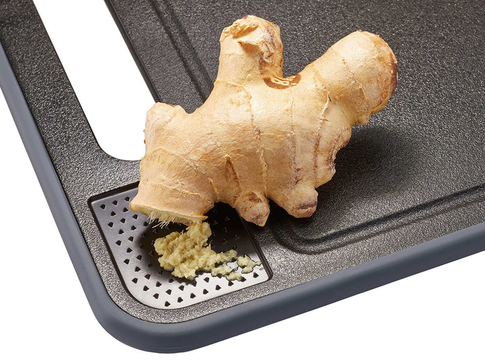 Dodatkowe funkcje sprawiają, że CUT PRO wyróżnia się na tle innych desek. Zintegrowana mini tarka doskonale sprawdza się przy ścieraniu imbiru czy skórki z cytryny, a uchwyt z wbudowaną ostrzałką do noży pozwala zachować ostrza w idealnym stanie. Antypoślizgowe obramowanie zapewnia stabilność podczas pracy, a przemyślana konstrukcja jest łatwa w czyszczeniu – nadaje się do mycia w zmywarce.