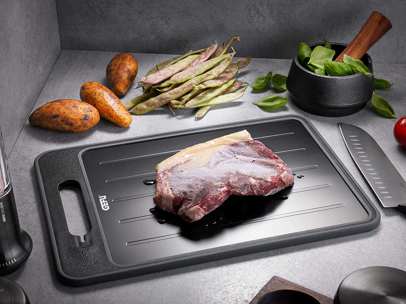 Deska CUT PRO to wszechstronne rozwiązanie, które usprawnia codzienne prace kuchenne. Dzięki innowacyjnej stronie wykonanej z czarnego aluminium, możesz skrócić czas rozmrażania produktów nawet o 60%, zachowując ich naturalny smak i jakość. Druga strona deski, z antypoślizgowego tworzywa sztucznego, gwarantuje bezpieczne i precyzyjne siekanie, dodatkowo wyposażona w rowek do zbierania soków, co utrzymuje porządek na blacie.