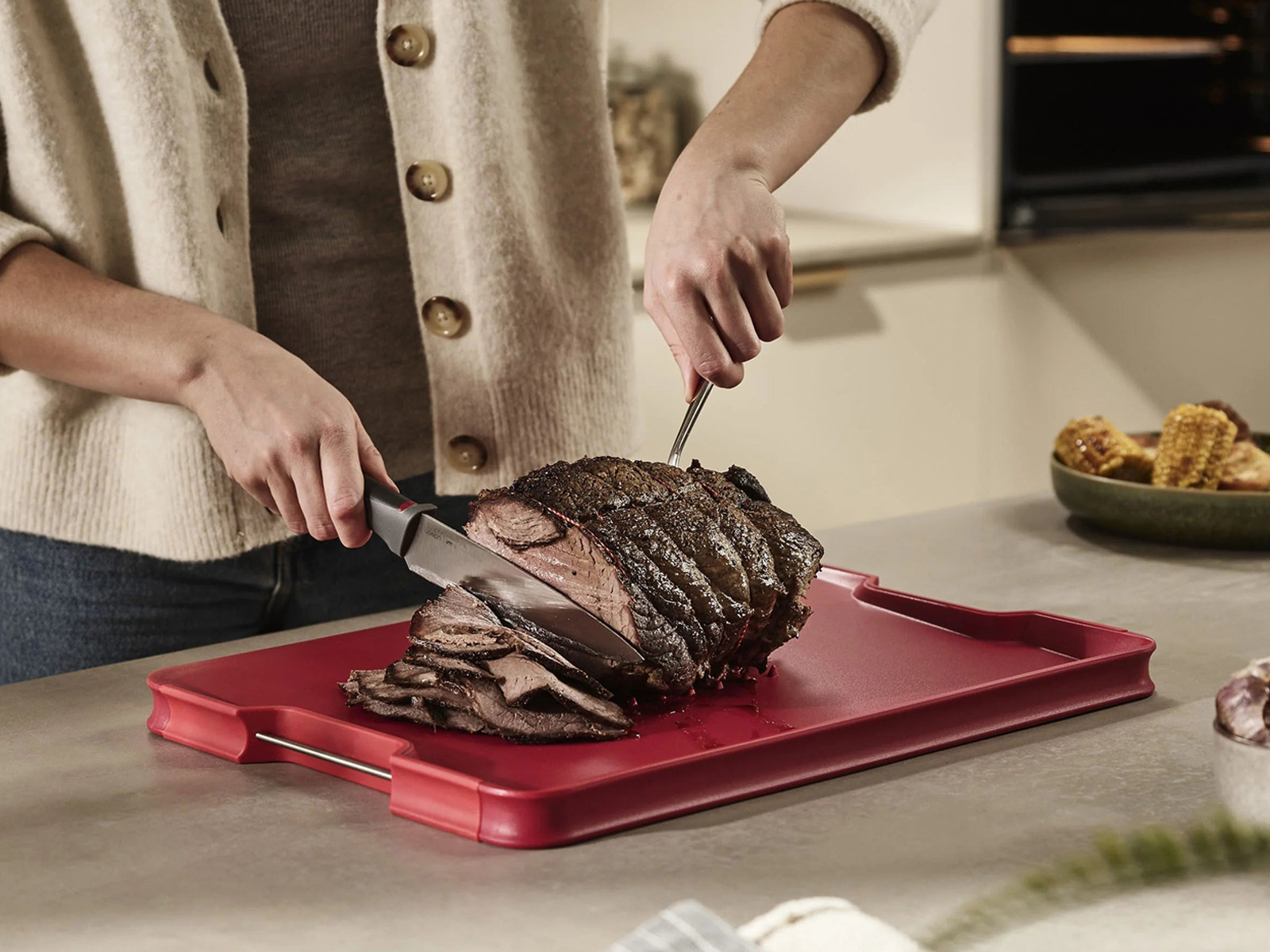 Zaokrąglone brzegi ułatwiają wylewanie zebranego na desce płynu, a antypoślizgowe krawędzie zabezpieczają przed przesuwaniem się deski podczas krojenia.