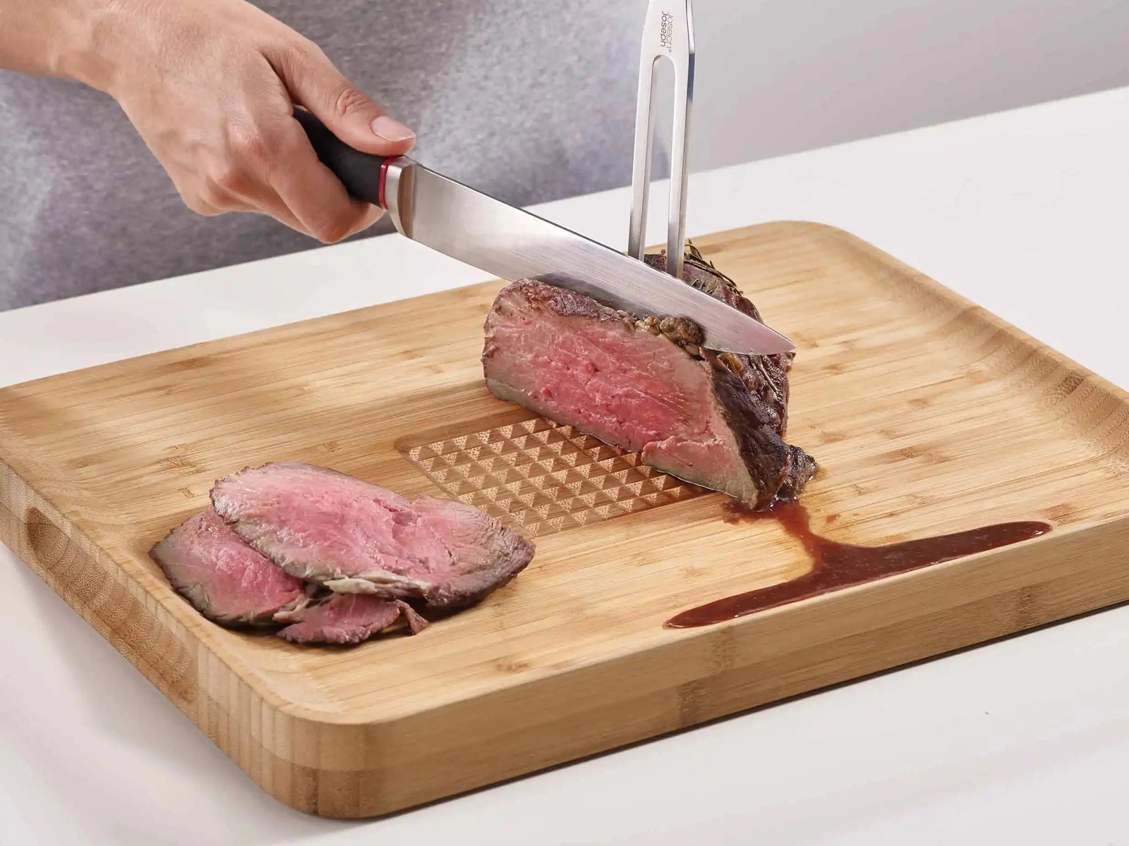Po środku deski znajduje się zintegrowany z nią uchwyt do przytrzymywania krojonych produktów z wypustkami zapobiegającymi ich przesuwaniu się.