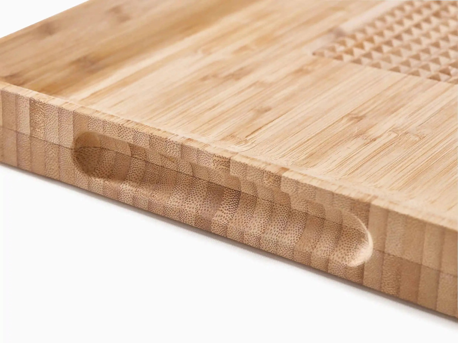 Deska w prostokątnym kształcie o zaokrąglonych rogach wykonana z naturalnego drewna bambusowego.
