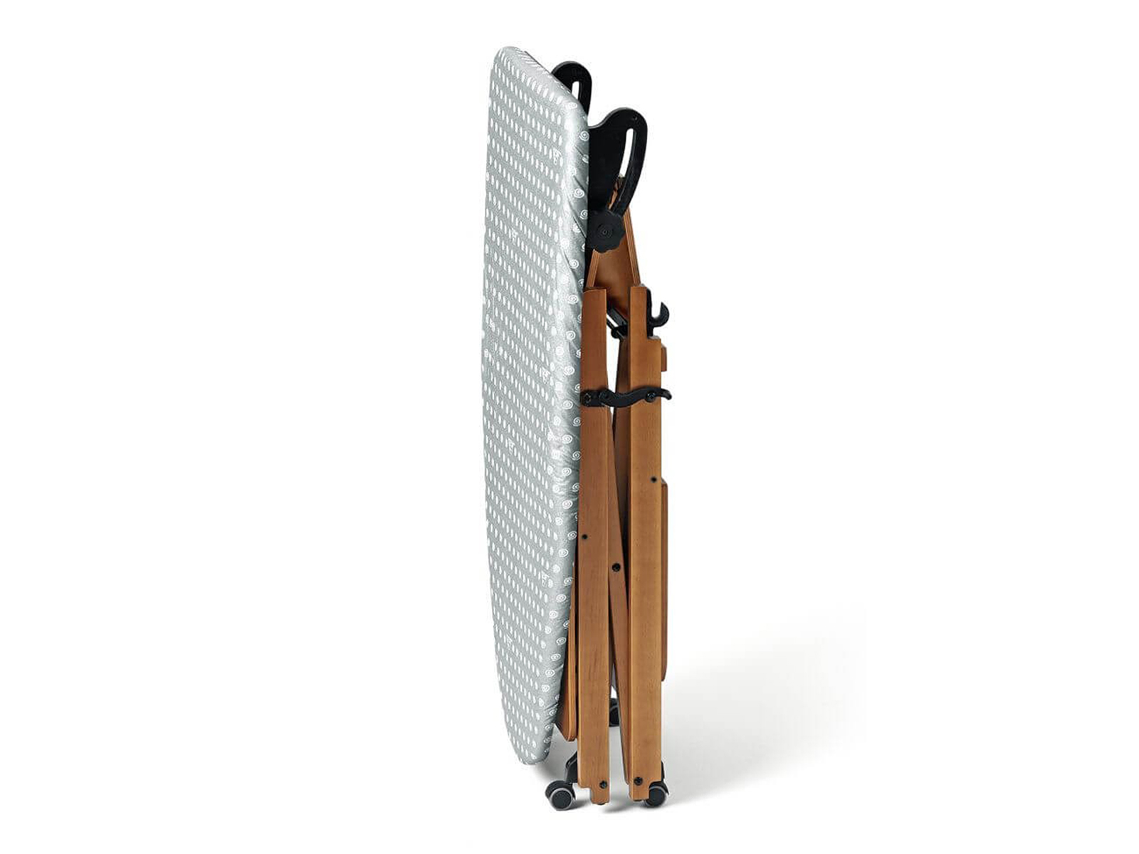 Stylowa deska do prasowania na kółkach z drewnianą konstrukcją i praktycznymi dodatkami