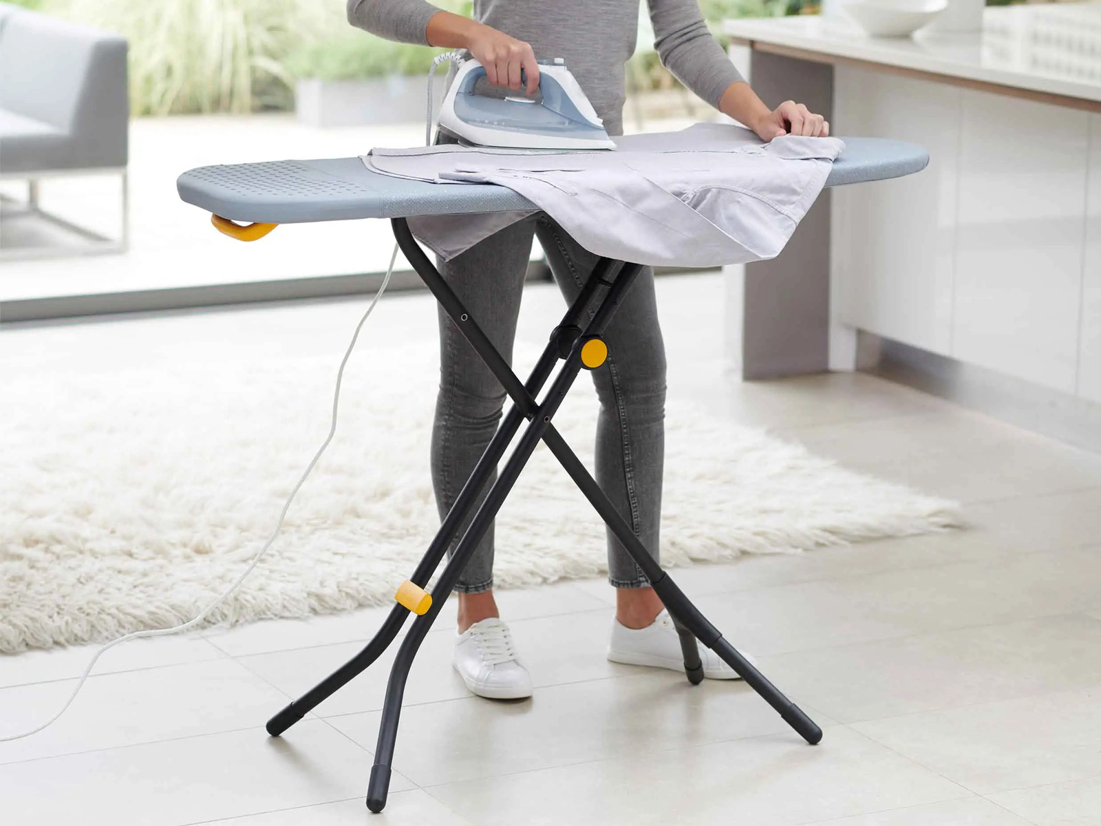 Elegancka i praktyczna deska do prasowania o regulowanej wysokości z wydzielonym miejsce do bezpiecznego odkładania żelazka.