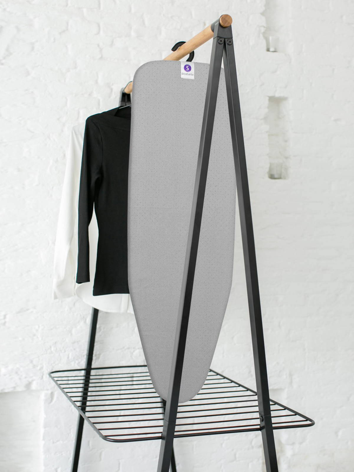 Składana na płasko w kilka sekund konstrukcja deski ułatwia jej przechowywanie, a duży chowany haczyk umożliwia zawieszenie jej na drążku szafy, wieszaka lub na uchwycie ściennym.