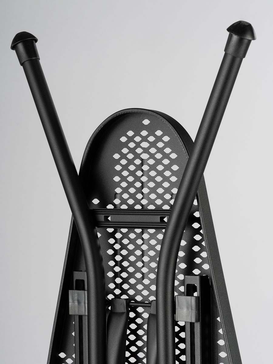 Perforowany blat wykonany z jednego kawałka metalu został zaprojektowany specjalnie z myślą o prasowaniu z wysokim wyrzutem pary – para swobodnie przenika przez powierzchnię, przyspieszając cały proces prasowania. Pokrycie z tkaniny zawierającej mikrocząsteczki metalu jest odporne na wysokie temperatury, co zapewnia trwałość i komfort pracy nawet przy mocnych żelazkach parowych.