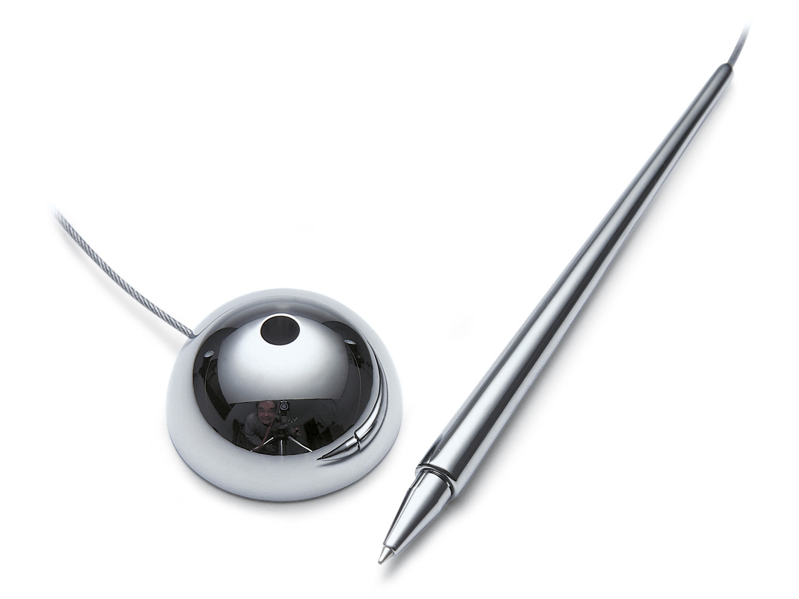 Długopis o smukłym lekko profilowanym w kształcie idealnie pasuje do podstawki w kształcie kopuły, obie części wykonane z chromowanego metalu.