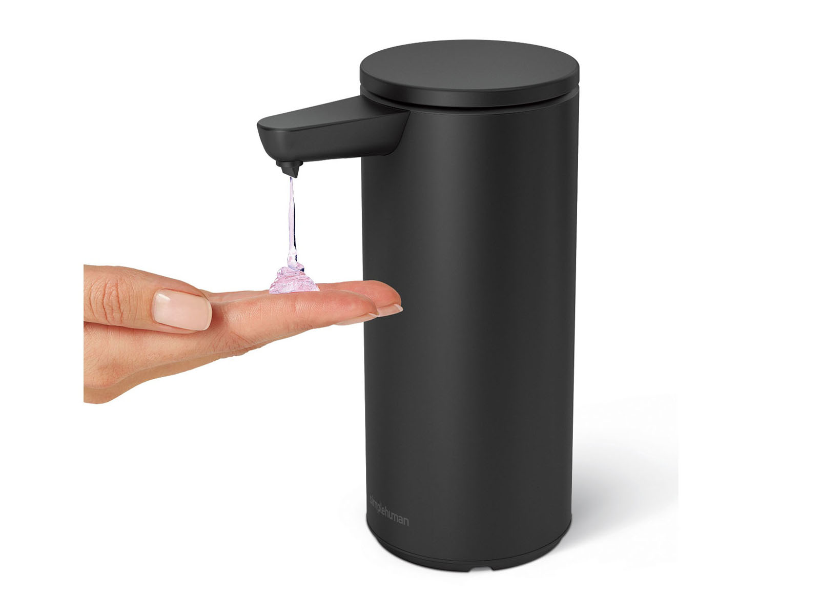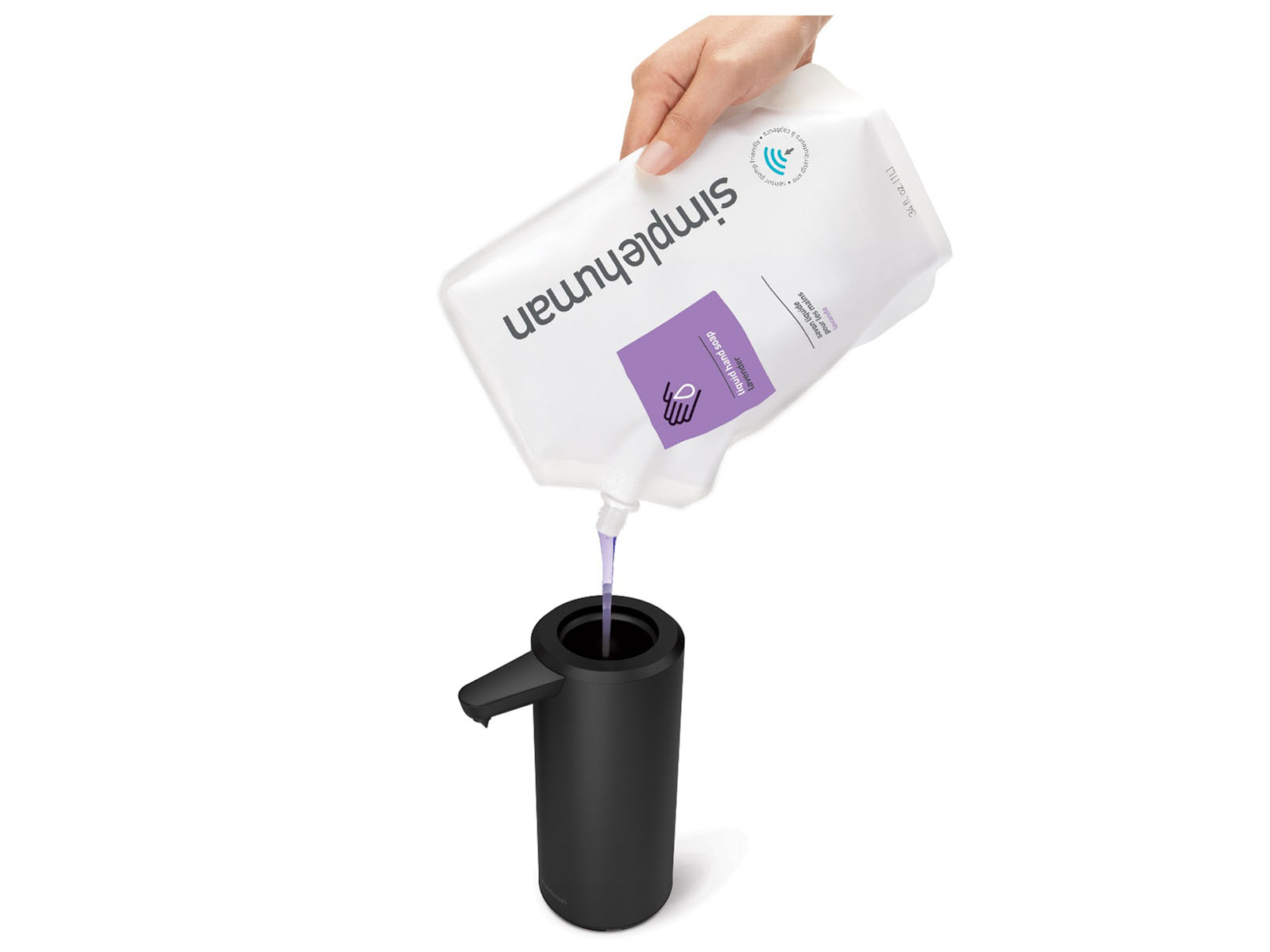 Szeroka szyjka uformowana w kształcie lejka ułatwia bezproblemowe uzupełnianie zawartości. Aby zapewnić optymalne działanie dozownika, zaleca się używanie oryginalnych mydeł marki Simplehuman. Pod pokrywką znajduje się kod QR, który umożliwia szybkie zamówienie mydła.