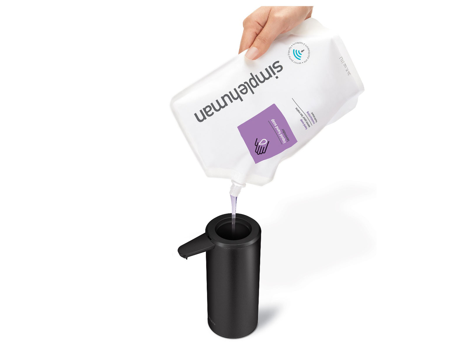 Szeroka szyjka uformowana w kształcie lejka ułatwia bezproblemowe uzupełnianie zawartości. Aby zapewnić optymalne działanie dozownika, zaleca się używanie oryginalnych mydeł marki Simplehuman. Pod pokrywką znajduje się kod QR, który umożliwia szybkie zamówienie mydła.