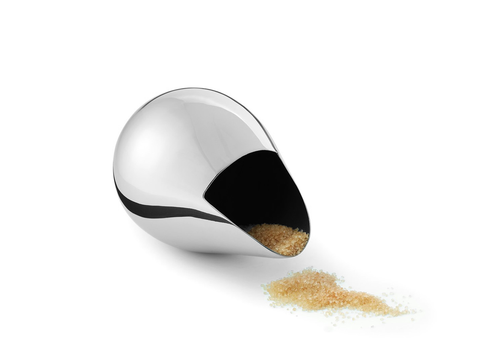 Pojemnik wykonany z polerowanej na wysoki połysk stali nierdzewnej o kształcie przypominającym kroplę z wycięciem tworzącym dzióbek do dozowania.