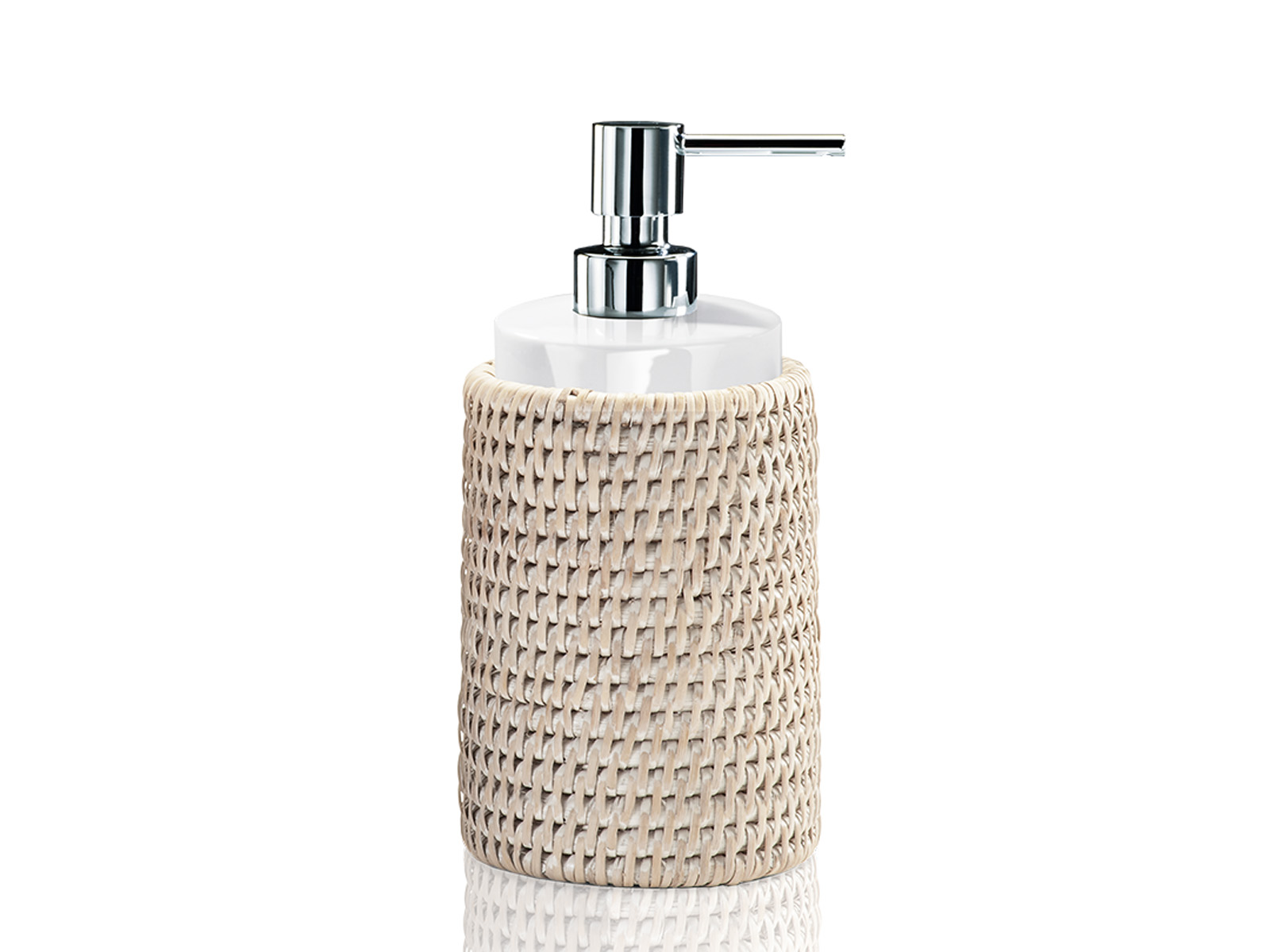 Elegancki nablatowy dozownik na mydło z cylindrycznym pojemnikiem wykonanym z białej gładkiej porcelany i umieszczonym w obudowie z naturalnego barwionego ratanu.