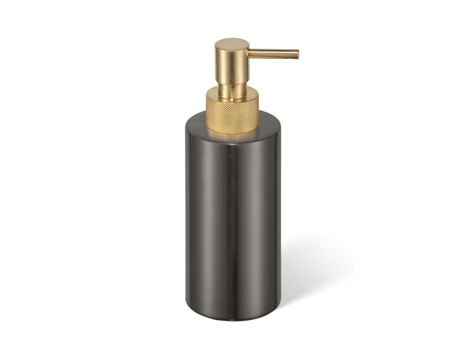 Elegancki nablatowy dozownik na mydło z cylindrycznym pojemnikiem wykonany z wysokiej jakości mosiądzu w wykończeniu matowego surowego metalu oraz elementami z pozłacanego 24-karatowym złotem mosiądzu w wykończeniu matowym.