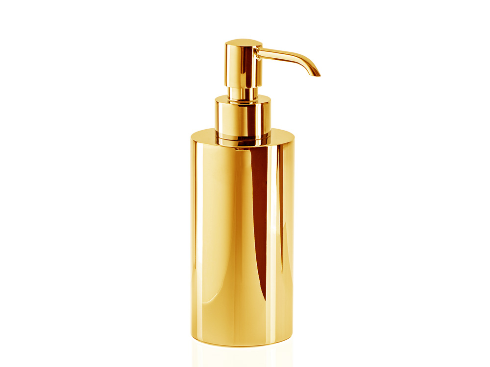 Elegancki nablatowy dozownik na mydło z cylindrycznym pojemnikiem wykonany z wysokiej jakości pozłacanego 24-karatowym złotem mosiądzu