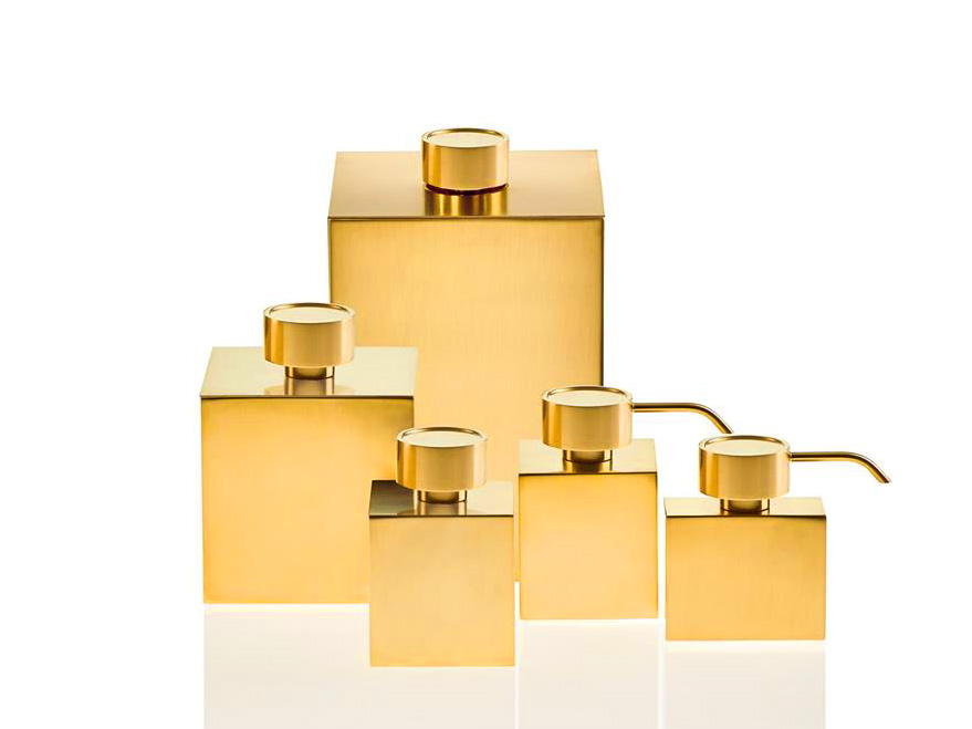 Elegancki nablatowy dozownik na mydło z prostokątnym pojemnikiem wykonany z wysokiej jakości pozłacanego 24-karatowym złotem mosiądzu.