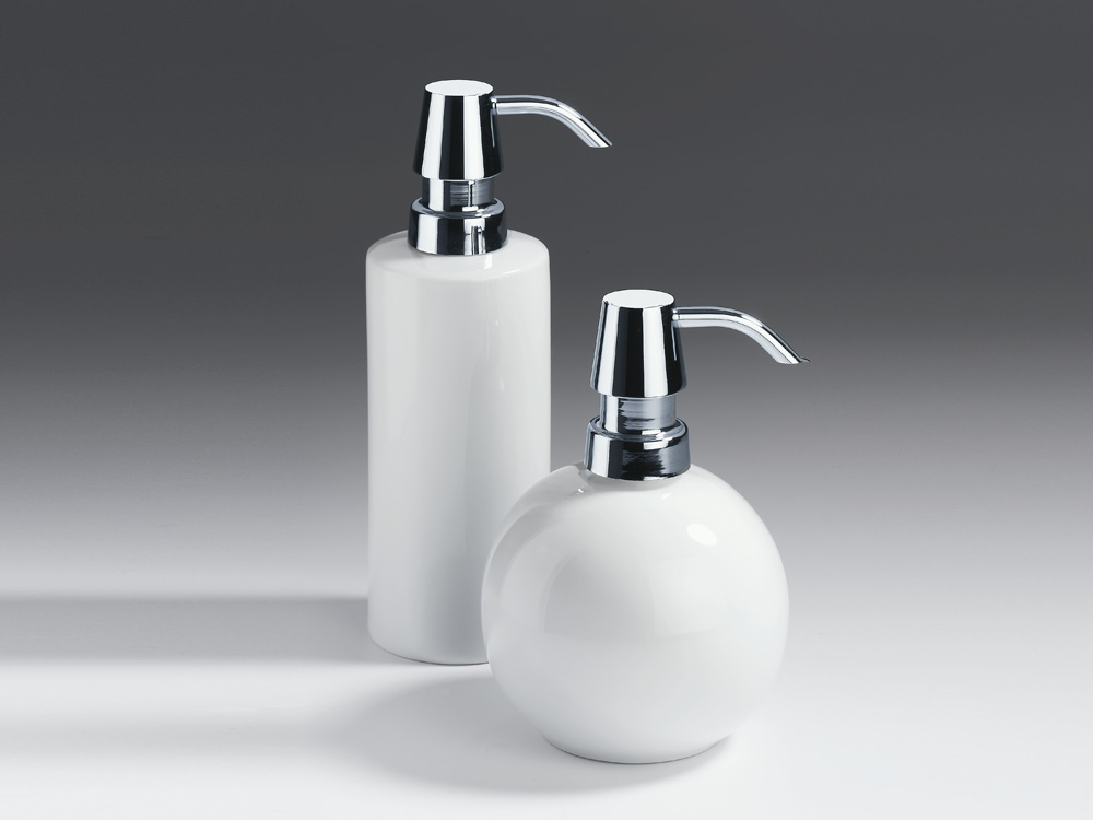 Elegancki nablatowy dozownik na mydło z kulistym pojemnikiem wykonanym z białej gładkiej porcelany.