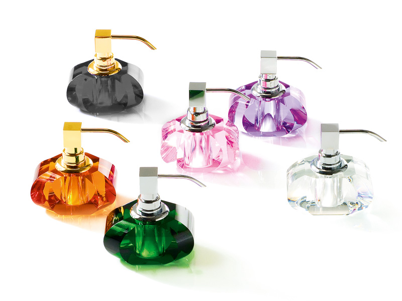 Dozownik o charakterystycznym owalnym geometrycznym kształcie przypominającym flakon perfum o "ciętych" bokach dodatkowo podkreślających blask załamującego się światła.