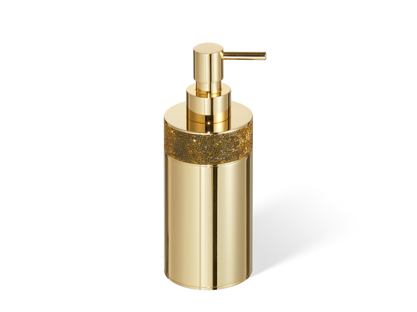 Elegancki nablatowy dozownik na mydło z pojemnikiem ozdobionym szerokim pasem gęsto osadzonych kryształków Swarovskiego.
