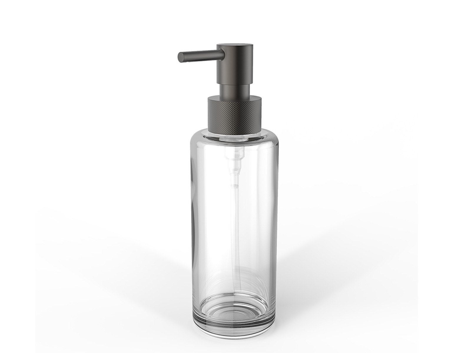 Elegancki nablatowy dozownik na mydło z cylindrycznym smukłym pojemnikiem wykonanym z przezroczystego bezbarwnego szkła.