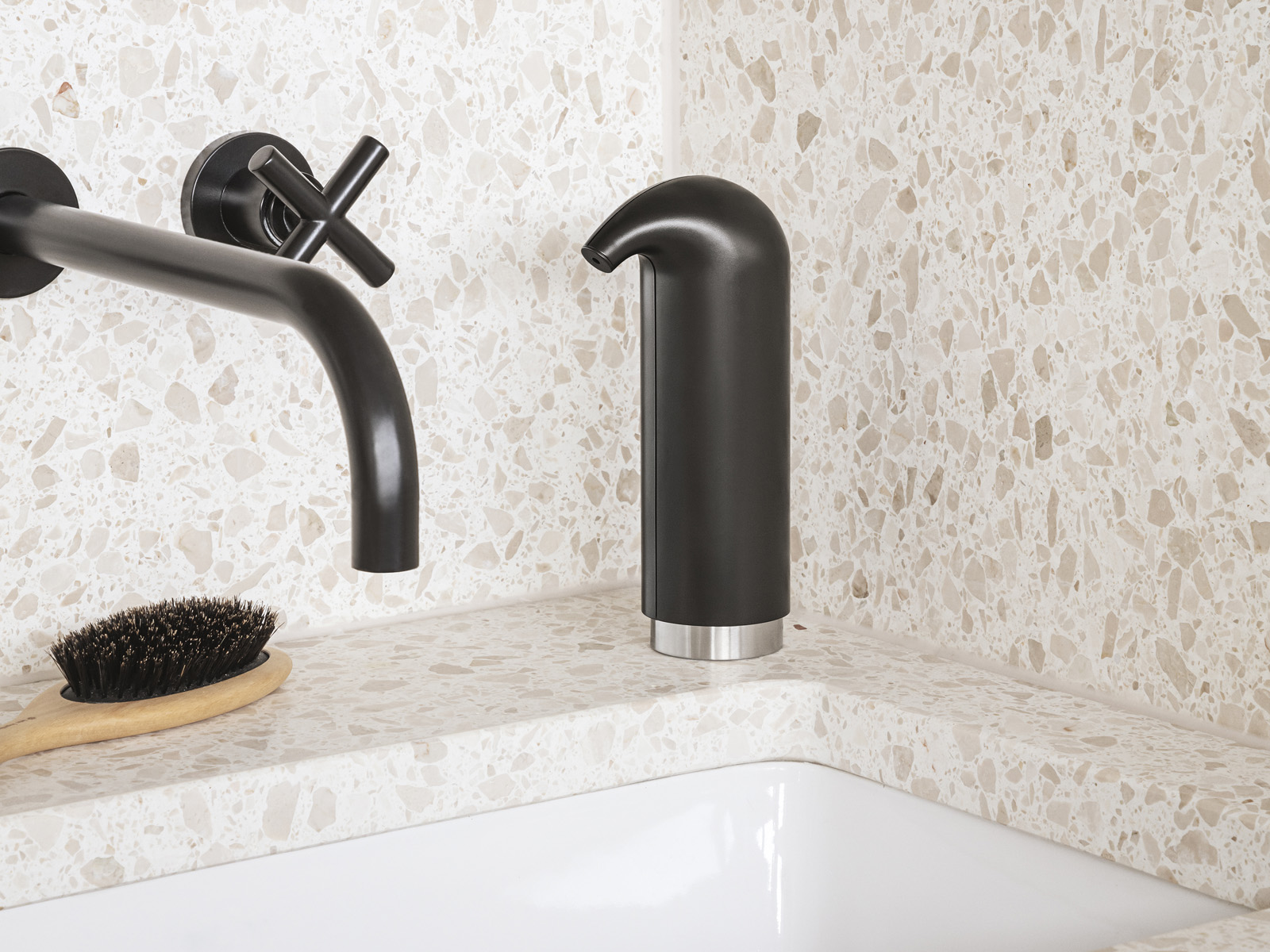 Dozownik wykonany z solidnego tworzywa sztucznego w wykończeniu matowym o cylindrycznym kształcie zakończony łukowato w dzióbek z podstawą ze stali nierdzewnej.