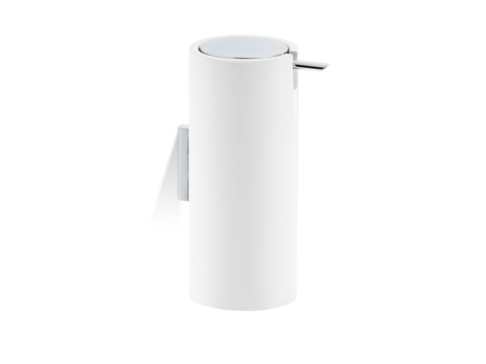 Elegancki dozownik na mydło z cylindrycznym pojemnikiem do montażu na ścianie wykonany z innowacyjnego, odpornego na uszkodzenia a zarazem przyjaznego dla środowiska kompozytu mineralnego.