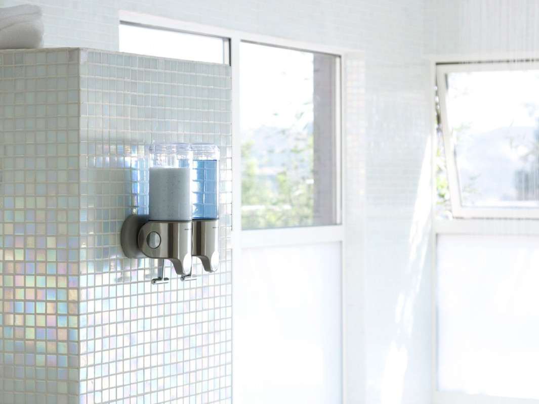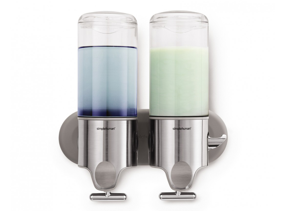 Elegancki i praktyczny podwójny dozownik montowany na ścianie z pompkami ze stali nierdzewnej.