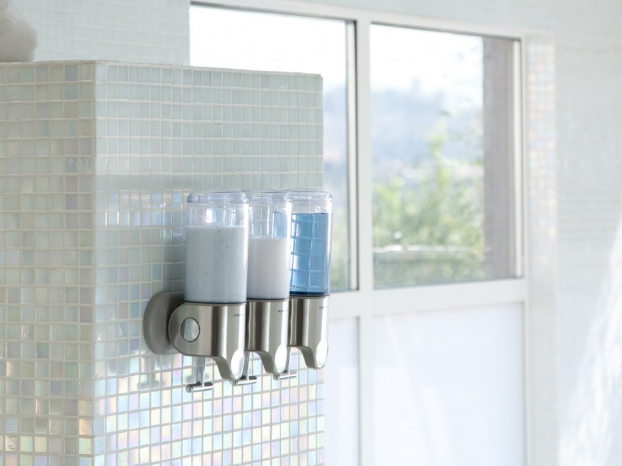 Elegancki i praktyczny potrójny dozownik montowany na ścianie z pompkami ze stali nierdzewnej.