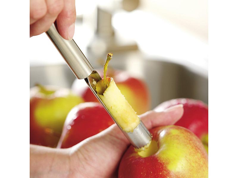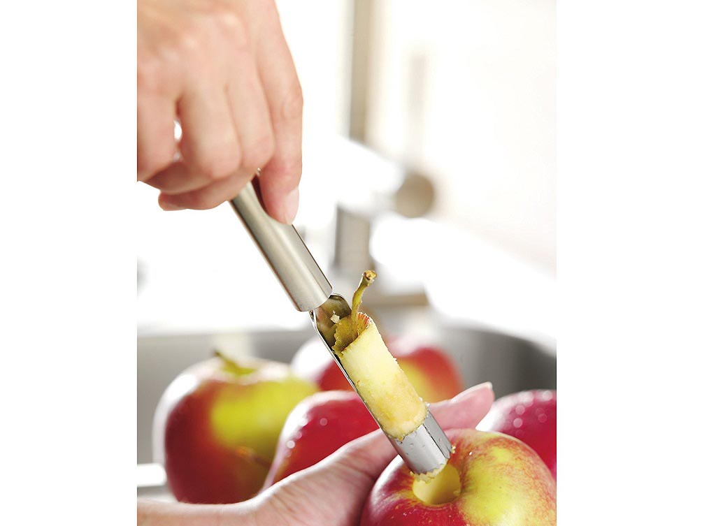 Elegancka kuchenna drylownica do jabłek umożliwia wydrążanie gniazd nasiennych bez konieczności rozcinania owocu.