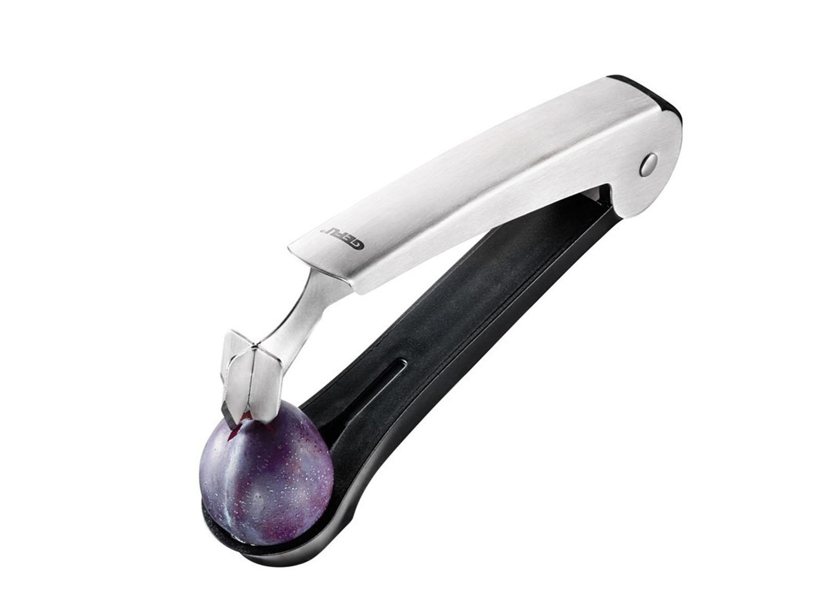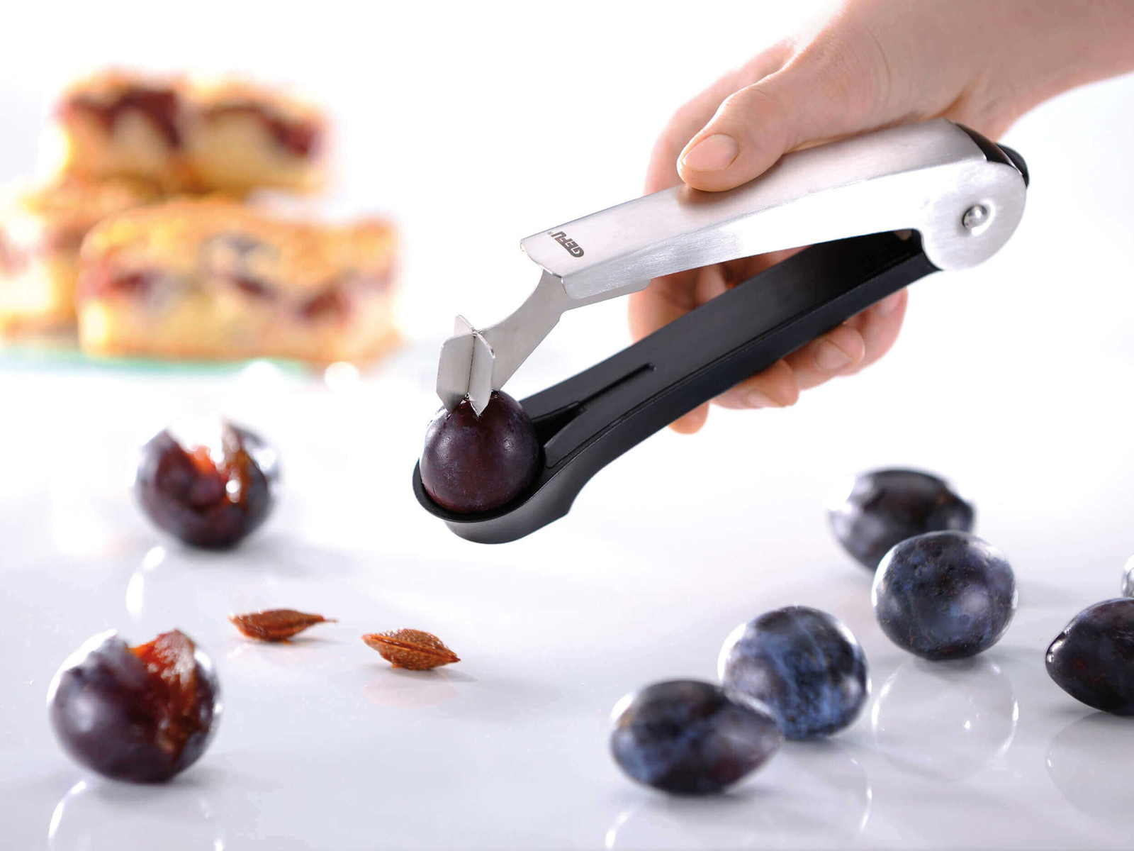 Drylownica GEFU Dropio to funkcjonalne narzędzie, które ułatwia szybkie usuwanie pestek ze śliwek do ciast, tart i kompotów. Wystarczy umieścić owoc w uchwycie i nacisnąć, aby pestka została usunięta, a miąższ pozostał gotowy do wykorzystania. Solidna konstrukcja ze stali nierdzewnej i tworzywa sztucznego gwarantuje trwałość i możliwość mycia w zmywarce, a zamykana forma i kompaktowe wymiary upraszczają przechowywanie w szafkach.