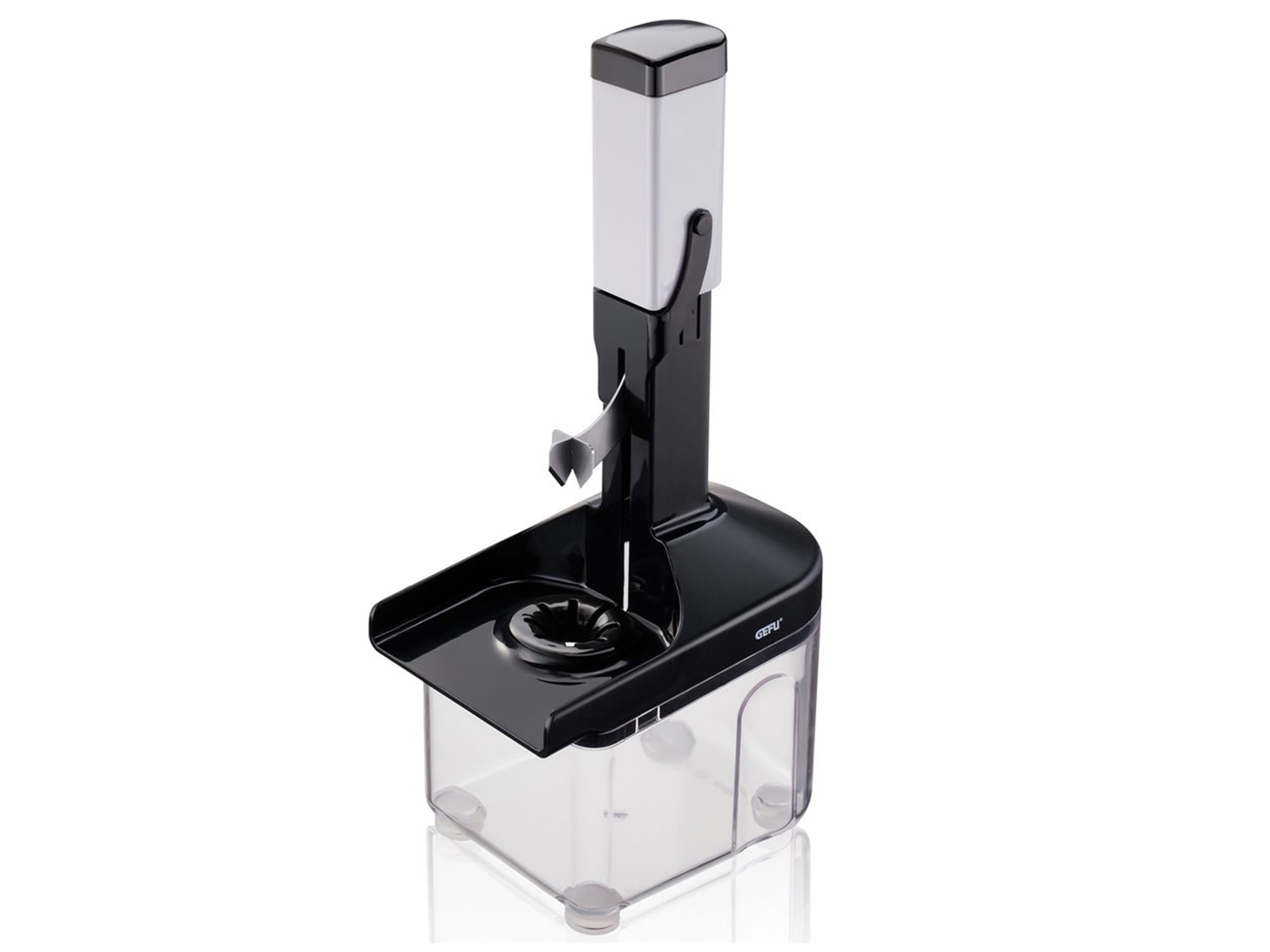 Drylownica GEFU Corer pozwala na błyskawiczne i wygodne usuwanie pestek ze śliwek czy moreli. Wystarczy nacisnąć tłok, aby pestka trafiła do pojemnika pod spodem, a owoc, wstępnie pokrojony, do postawionej miski. Urządzenie wyposażono w 2 wymienne wkłady dopasowane do różnych owoców o maksymalnej średnicy 5 cm i wielkości 5,5 cm. Antypoślizgowe nóżki i duży, przezroczysty pojemnik na pestki zwiększają wygodę użytkowania. Dodatkowo, przemyślana konstrukcja umożliwia łatwy demontaż – trzeba tylko zdjąć sprężynę i przesunąć tłok w dół.
