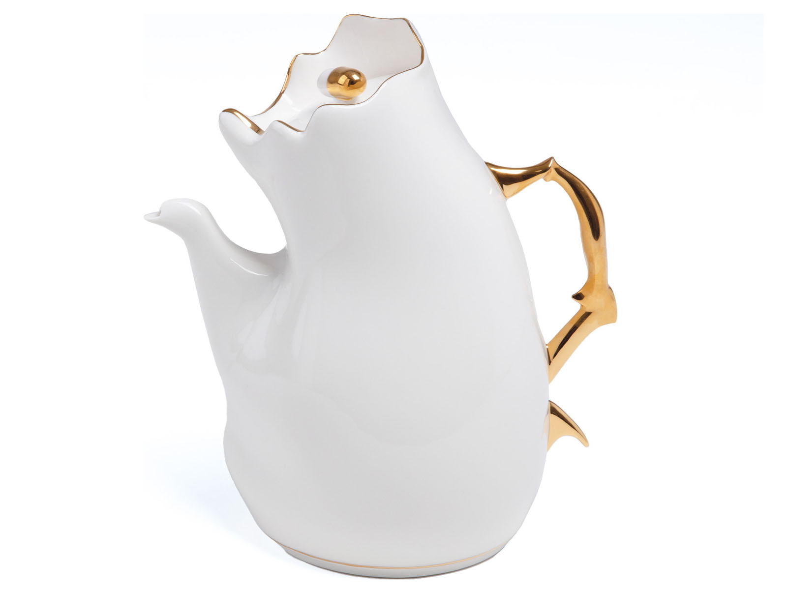 Seletti Meltdown to bardzo oryginalna kolekcja porcelanowych naczyń. Motywem przewodnim są nieregularne kształty, które sprawiają wrażenie jakby zostały przypadkowo uformowane podczas stopienia się pierwotnych regularnych form. Uchwyty, krawędzie oraz mniejsze detale naczyń są malowane na kolor złoty.