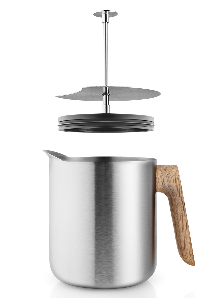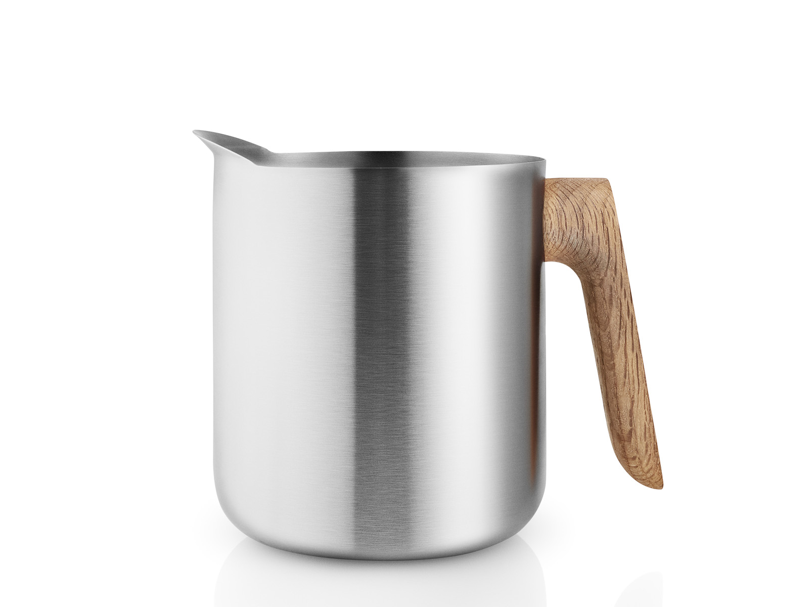 Dzbanek o prostym cylindrycznym kształcie wykonany ze szczotkowanej stali nierdzewnej z dębowym geometrycznym uchwytem z zaokrąglonymi krawędziami zapewniającym pewny chwyt.