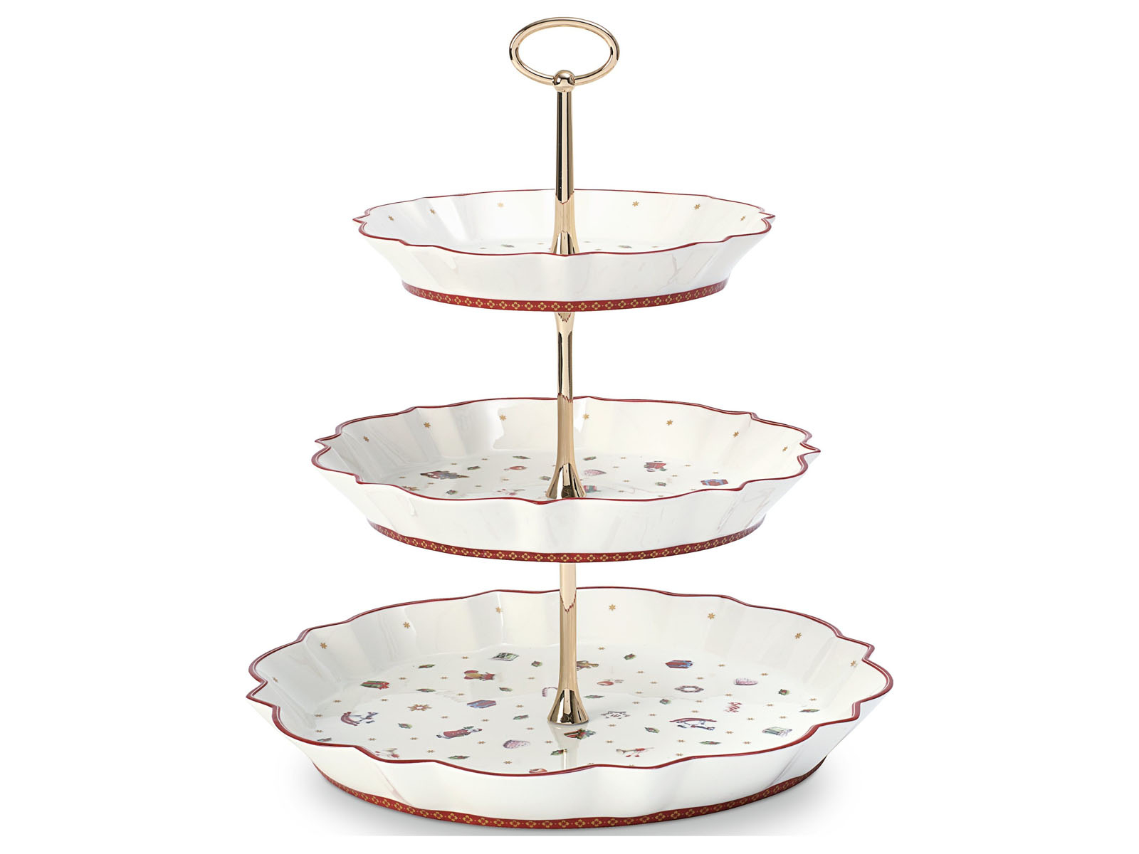 Etażerka Toy's Delight idealnie wpisuje się w klimat i świąteczną stylistykę kolekcji. Bardzo elegancka trzypoziomowa konstrukcja, która składa się z trzech różnej wielkości talerzy oraz złotego trzonu zwieńczonego pięknym owalnym uchwytem