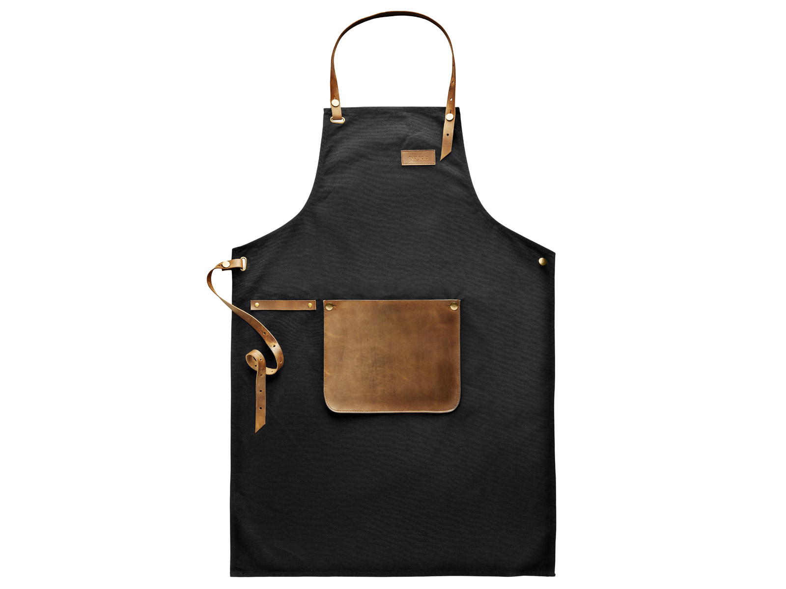 Oryginalny solidny fartuch kuchenny wykonany z wytrzymałego impregnowanego płótna ze stylowymi detalami ze skóry naturalnej.