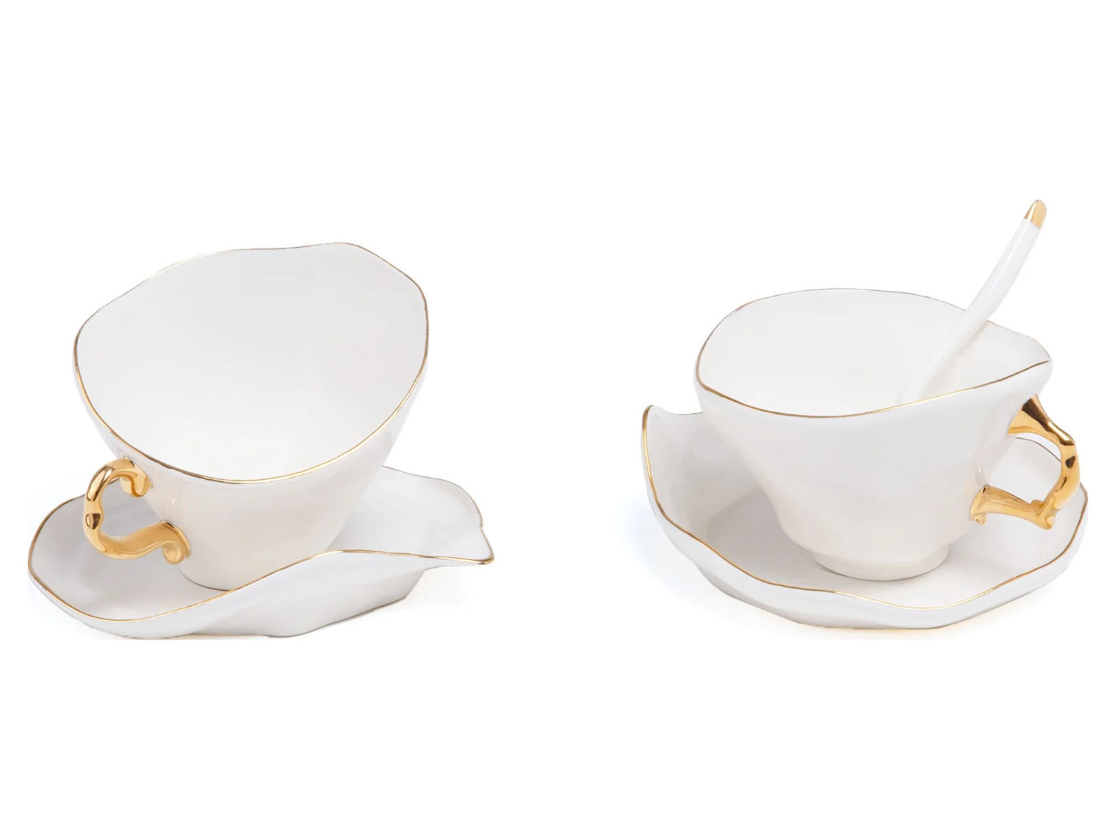 Seletti Meltdown to bardzo oryginalna kolekcja porcelanowych naczyń. Motywem przewodnim są nieregularne kształty, które sprawiają wrażenie jakby zostały przypadkowo uformowane podczas stopienia się pierwotnych regularnych form. Uchwyty, krawędzie oraz mniejsze detale naczyń są malowane na kolor złoty.