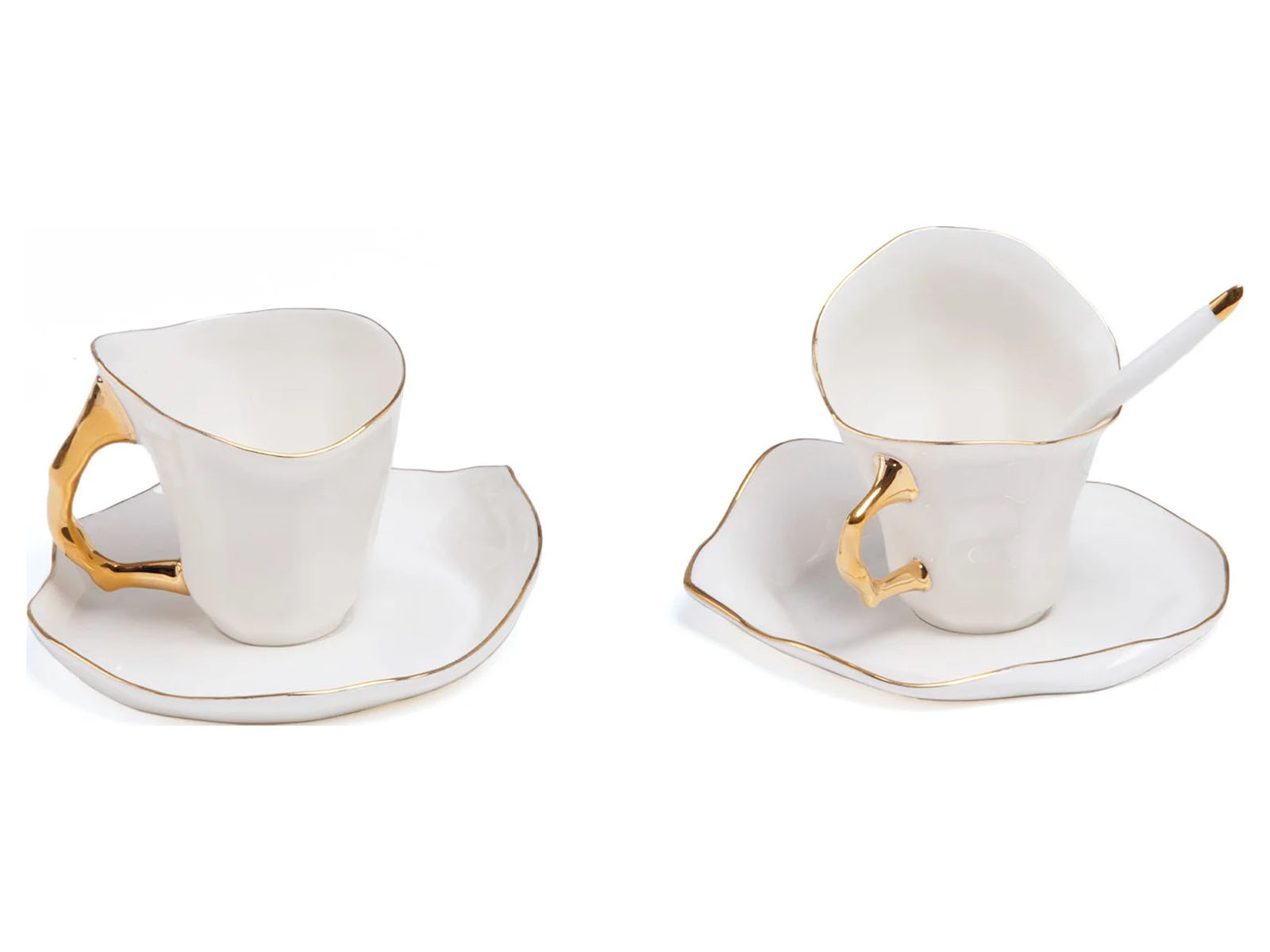 Seletti Meltdown to bardzo oryginalna kolekcja porcelanowych naczyń. Motywem przewodnim są nieregularne kształty, które sprawiają wrażenie jakby zostały przypadkowo uformowane podczas stopienia się pierwotnych regularnych form. Uchwyty, krawędzie oraz mniejsze detale naczyń są malowane na kolor złoty.