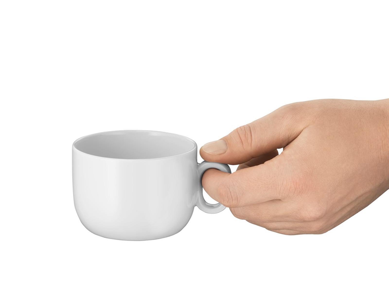 Ergonomiczne uchwyty zapewniają wygodny i pewny chwyt filiżanki wypełnionej kawą.